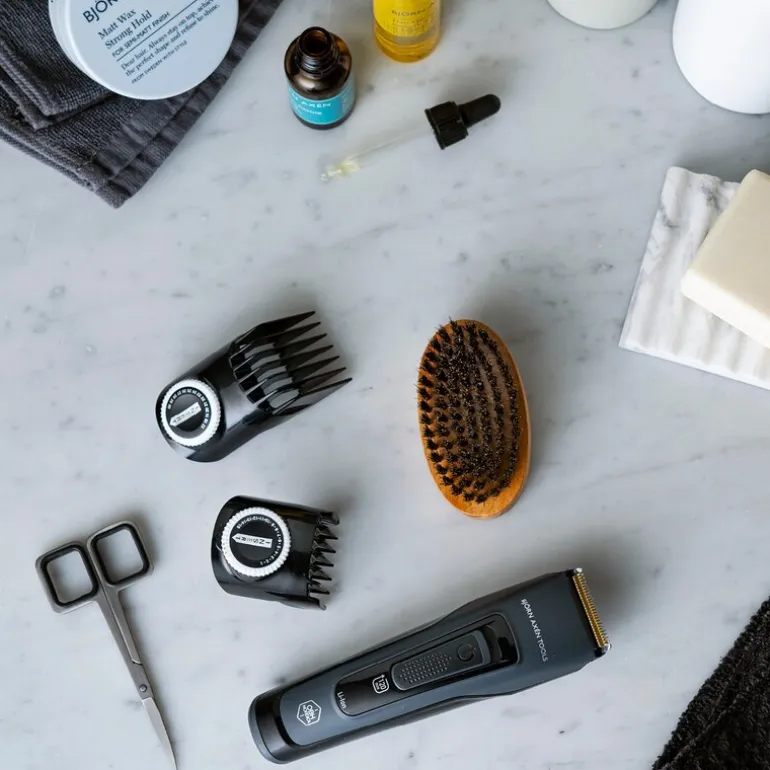 Oppnå perfekt skjeggpleie hjemme eller på reise med Björn Axén Tools hår- og skjeggtrimmersett HH4500N0 fra OBH Nordica. Settet inkluderer en kraftig skjeggtrimmer, to kammer, bartesaks, børste med naturbust og praktisk reiseetui – utviklet for deg som vil ha kontroll over hver detalj.