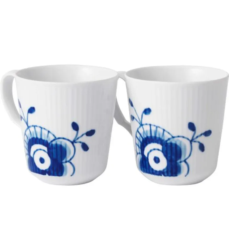 Blå Mega Rfilet krus 28 cl, 2 stk. Blå mega riflet er en nytolkning av Musselmalt riflet – mønsteret fra 1775 som har blitt en del av Danmarks kulturarv. I Mega har utvalgte deler av det opprinnelige mønsteret blitt forstørret av Karen Kjælgård-Larsen. Hver del av serien er unik og håndmalt, akkurat som Musselmalt riflet. Kan vaskes i oppvaskmaskin.