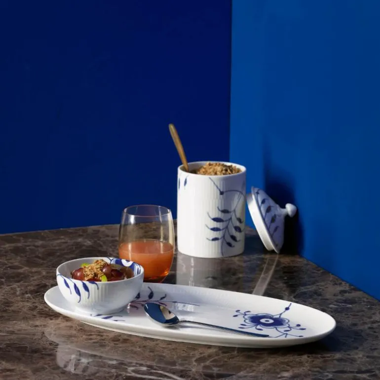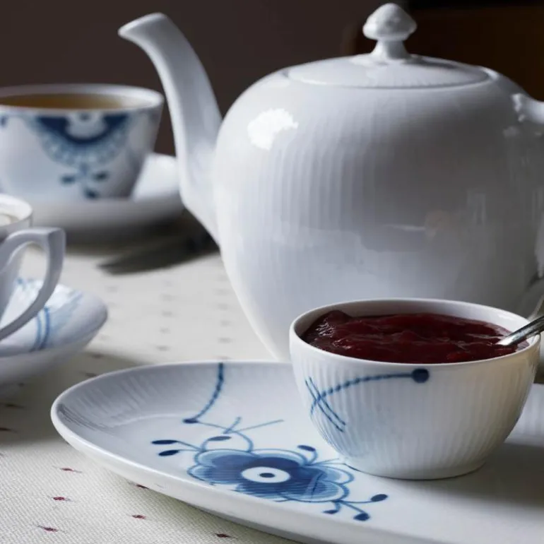 Blå Mega Riflet er både gjenkjennelig og overraskende forfriskende. I denne uvanlige nytolkningen av det klassiske mønsteret Musselmalt Riflet, har utvalgte detaljer blitt forstørret, men er fortsatt malt for hånd, slik at den originale og levende blå effekten er bevart. Mønsteret Blå Mega Riflet ble skapt av den unge designstudenten Karen Kjældgård-Larsen i 2000, og dette signaliserte starten på et nytt eventyr. Det berømte håndmalte mønsteret har blitt et kjent navn igjen som uttrykker både sin historiske autentisitet og kreative, innovative tenkning. Blå Mega Riflet ble opprinnelig designet med 8 forskjellige mønstre. På baksiden av Mega-produktet vil du finne et nummer. Dette refererer til mønsteret på dette bestemte produktet. Porselen.