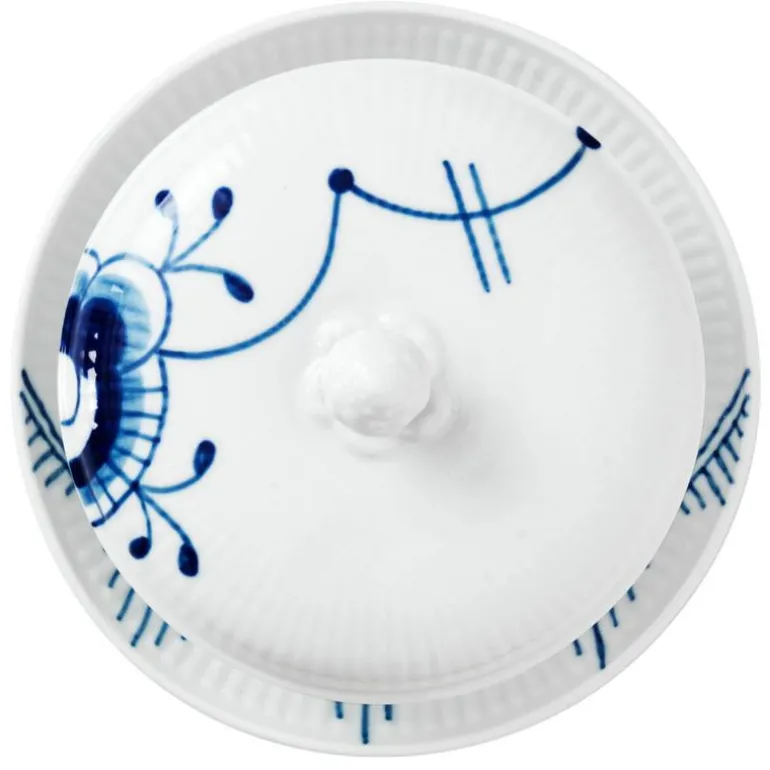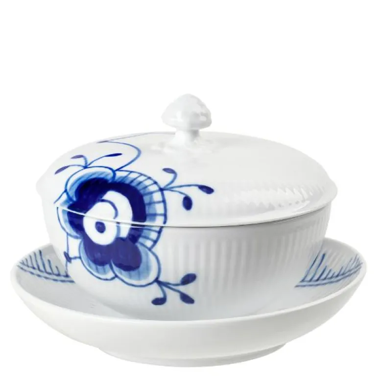 Blå Mega Riflet skål med lokk og asjett er tilgjengelig i et praktisk sett. Ideell for individuelle porsjoner med suppe eller andre småretter. Med de håndmalte dekorasjonene som organisk pryder skålen og lokket, er dette tredelte settet et nydelig tilskudd til Blå Mega Riflet-kolleksjonen.