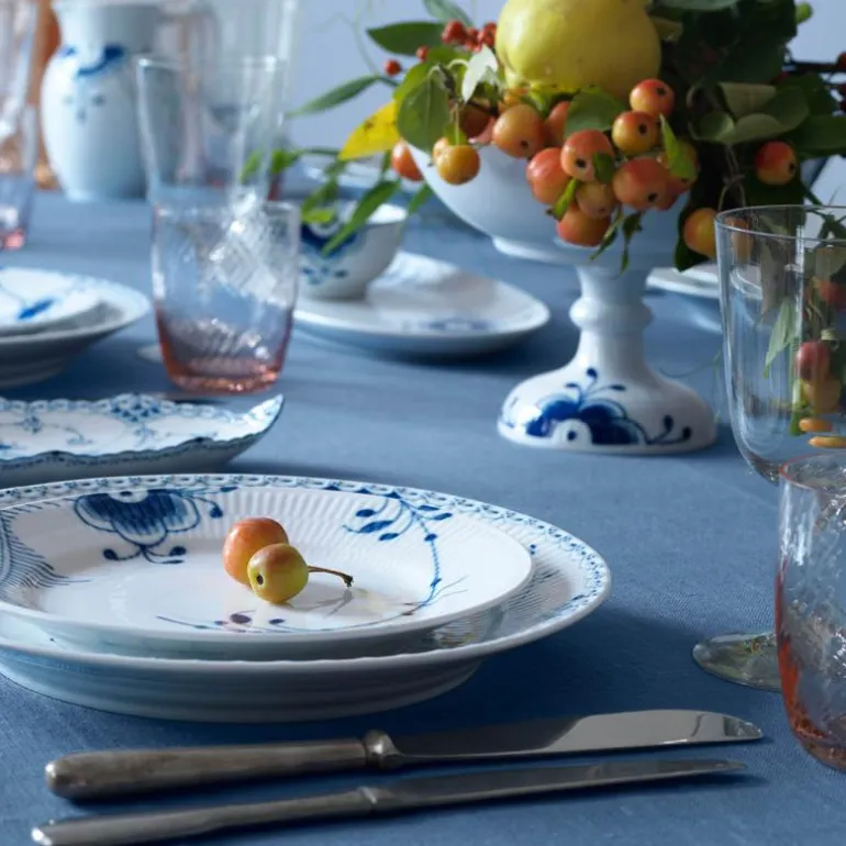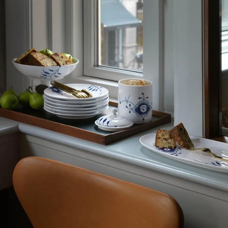 Blå Mega Riflet er både gjenkjennelig og overraskende forfriskende. I denne uvanlige nytolkningen av det klassiske mønsteret Musselmalt Riflet, har utvalgte detaljer blitt forstørret, men er fortsatt malt for hånd, slik at den originale og levende blå effekten er bevart. Mønsteret Blå Mega Riflet ble skapt av den unge designstudenten Karen Kjældgård-Larsen i 2000, og dette signaliserte starten på et nytt eventyr. Det berømte håndmalte mønsteret har blitt et kjent navn igjen som uttrykker både sin historiske autentisitet og kreative, innovative tenkning. Blå Mega Riflet ble opprinnelig designet med 8 forskjellige mønstre. På baksiden av Mega-produktet vil du finne et nummer. Dette refererer til mønsteret på dette bestemte produktet. Porselen.