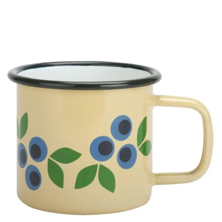 Nydelig emaljekopp med bærmotiv. Bruk den hjemme eller på tur – for eksempel er den fin til bærplukk i skogen. Plukkeputling i skogen og seriøst mye smaking underveis, det er nok den fineste formen for bærtur, i alle fall for de små. Derfor er vi tilhengere av den. Knallblå tunge, lilla fingertupper. Egenplukket syltetøy er nok det aller beste syltetøyet, en søt gave fra naturen til oss, tusen takk til den. Det er egentlig ikke mengden det kommer an på. Å fylle en liten emaljekopp med bær, for eksempel, det kan fort bli nok syltetøy til en hel, deilig brunostskive, det. Nyt turen og husk å ta lange kakaopauser!