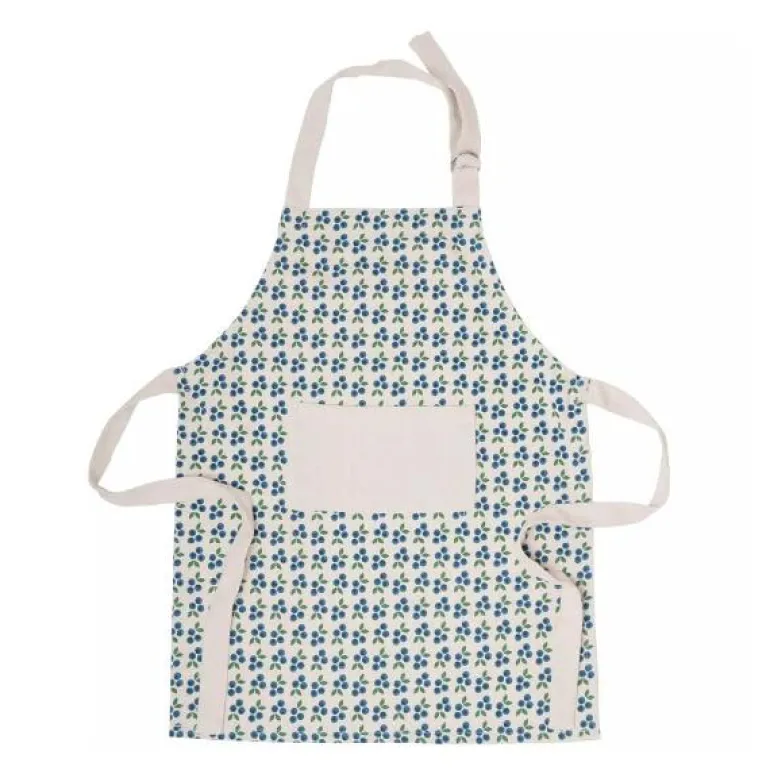Naturfarget forkle til voksen med blåbærtrykk laget i 100% organisk bomull. Finnes også til barn.