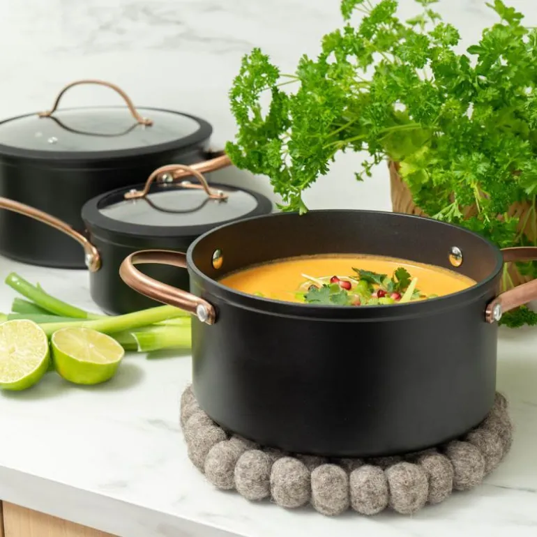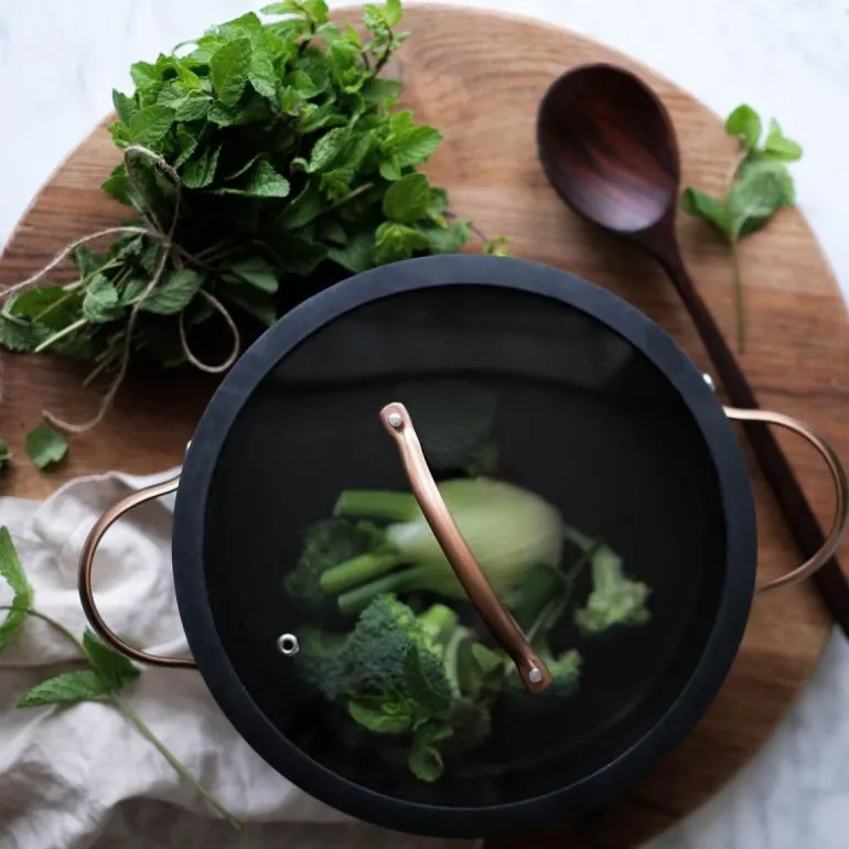 Black Copper er en serie gryter og panner fra Modern House, laget av belagt aluminium med kobberfargede håndtak for et elegant og funksjonelt design. Serien er tykkbunnet for jevn varmefordeling, noe som sikrer optimale resultater ved matlaging. Den er utstyrt med det avanserte KFCC G7 keramiske belegget, som er PFAS-fritt og designet for både holdbarhet og brukervennlighet.