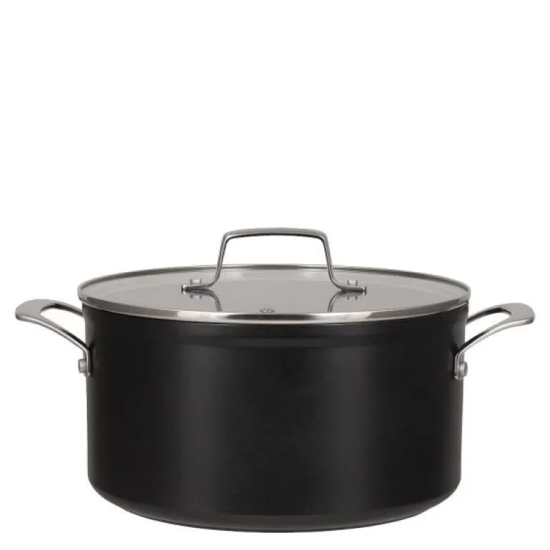 Black line gryte 4,2L svart, fra Modern House. Black Line er en førsteklasses serie av gryter og panner laget i belagt aluminium, kjent for sin tykkbunnede konstruksjon som sikrer jevn varmefordeling. Serien er utstyrt med det avanserte KFCC G7 keramiske belegget, som gir enestående slipp-lett egenskaper. Dette hardføre keramiske belegget hindrer at mat svir seg lett, noe som gjør produktene svært enkle å rengjøre.