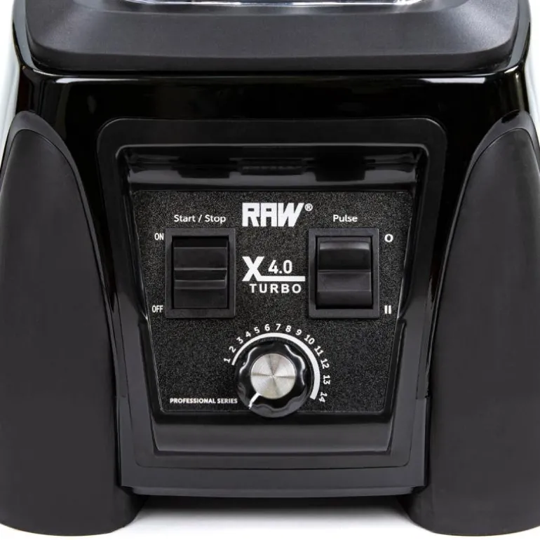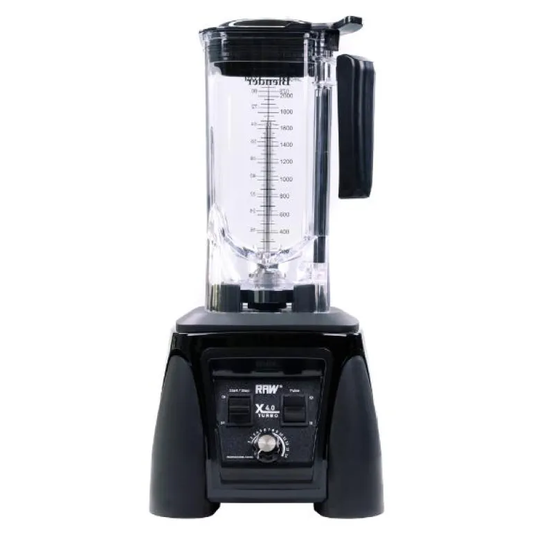 Blender X 4,0 Turbo 2380W 2,2L fra RAW i fargen svart er en profesjonell high-speed blender, som er utstyrt med en kraftig motor på 2380W og 4 hestekrefter. Den knuser alt fra nøtter, avokadokjerner og isbiter til hardere frukt og grønnsaker. Blenderen har en metallkopling og roterer med imponerende 35 000 omdreininger i minuttet, takket være de 6 knivene i robust rustfritt stål.