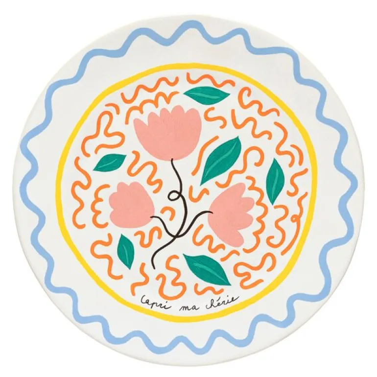 Bliss tallerken flat 27 cm rosa/gul fra Costa Nova. Tallerken, 27 cm. Tallerkenen oser av livsglede med sine lyserosa blomster, svungne oransje linjer og friske grønne blader, inspirert av den fargerike middelhavsnaturen. Perfekt til alt fra lette sommermåltider til festlige retter – bruk den til fiskeretter, grillede grønnsaker eller en sprø salat.