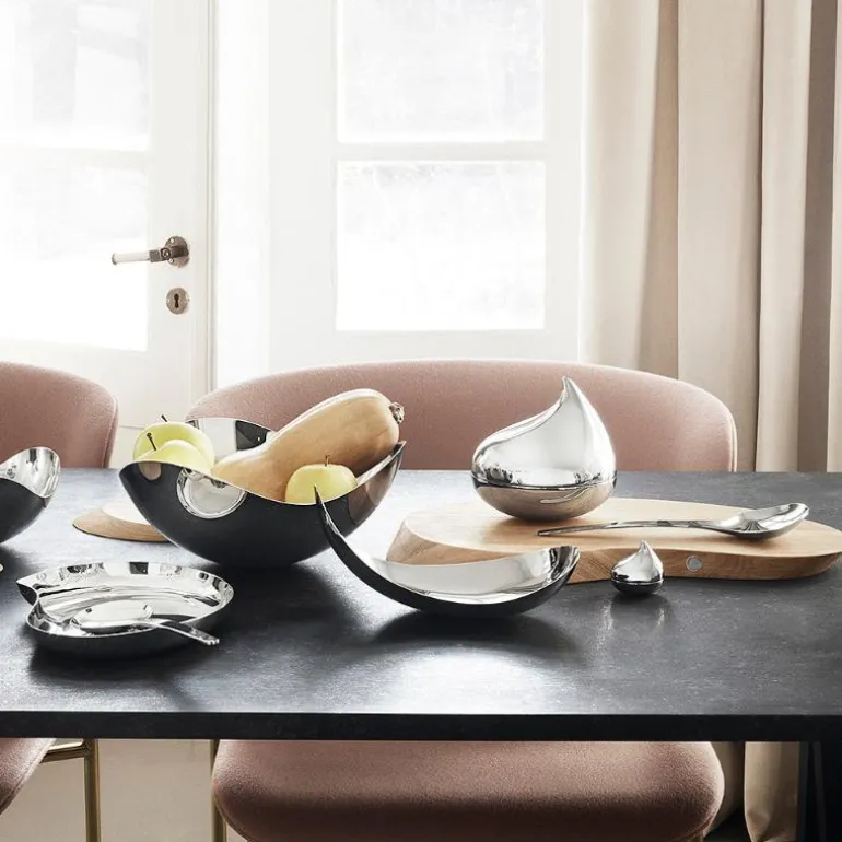 Inspirasjonen til Bloom serveringssett fra Georg Jensen kommer fra formen på kirsebærblomster i full blomst. Settet består av to serveringsskjeer i forskjellige størrelser. De er laget i rustfritt stål.