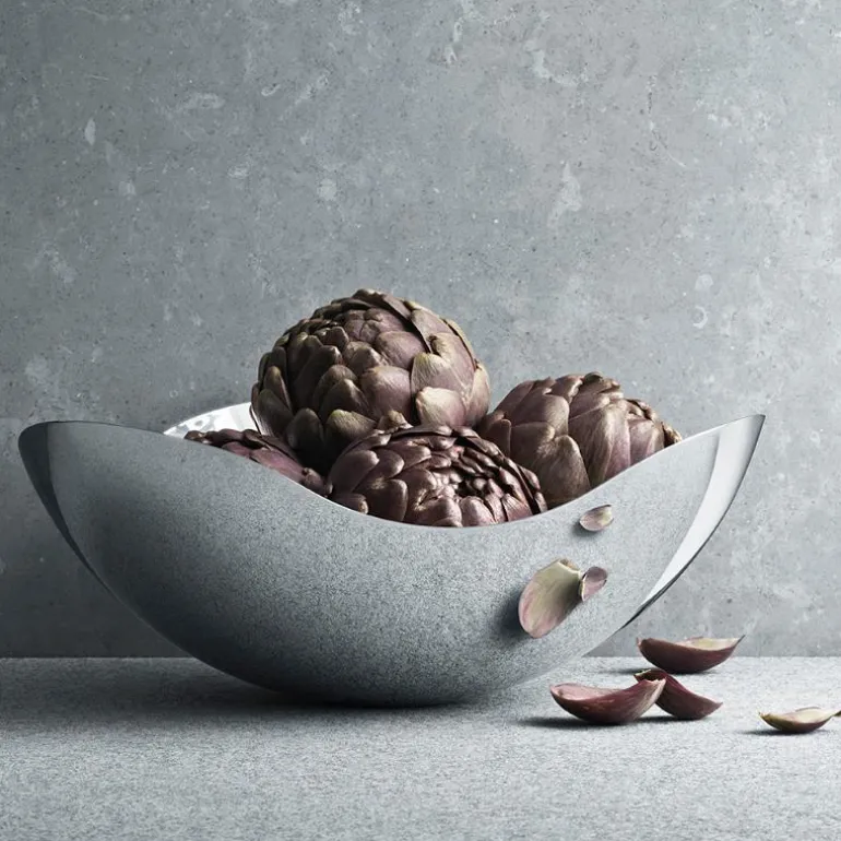 Inspirasjonen til Bloom skålene til Georg Jensen kommer fra formen på kirsebærblomster i full blomst. Skålene er laget i rustfritt stål og er fine til å servere mat i. De ser også lekre ut på ethvert bord. Mål: H: 14 cm Ø:24 cm.