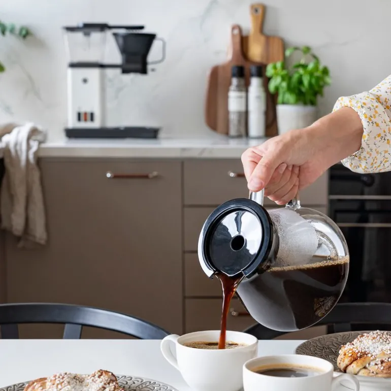 Lei av bitter kaffe? Med et enkelt knappetrykk får du kaffe med rikere aroma og fyldigere preg. Den unike bloomingfunksjonen fremhever kaffens naturlige sødme ved å bløtlegge den malte kaffen og dermed frigjøre karbondioksid før trakting. Det er karbondioksidet som bindes i kaffebønnene ved brenning, som kan gi kaffen et bittert preg. Bloomingfunksjonen er inspirert av traktemetoden Pour Over, men alt du trenger å gjøre er å trykke på en knapp! Den elegante, håndlagde glasskannen fylles med inntil 10 kopper kaffe om gangen på bare 5-7 minutter. Den ferdigtraktede kaffen har en optimal temperatur på 80-85 grader. Kaffetrakteren har også dryppstopp-funksjon for å redusere søl og auto-off som sikrer trygg bruk. Stilrene Blooming Coffee Maker har skrog i aluminium og er en stilig interiørdetalj på kjøkkenet. Nyt en kaffe med rikere aroma og fyldigere preg. Prøv selv i 100 dager – er du ikke fornøyd, får du pengene tilbake. – Unik bloomingfunksjon som gir kaffen rikere aroma og fyldigere preg – Elegant og robust håndlaget glasskanne som tåler oppvaskmaskin – Stilren og moderne design som pynter opp på kjøkkenet – Trakter inntil 10 kopper om gangen med optimal temperatur – Effektiv traktetid på 5-7 min som gir perfekt resultat.