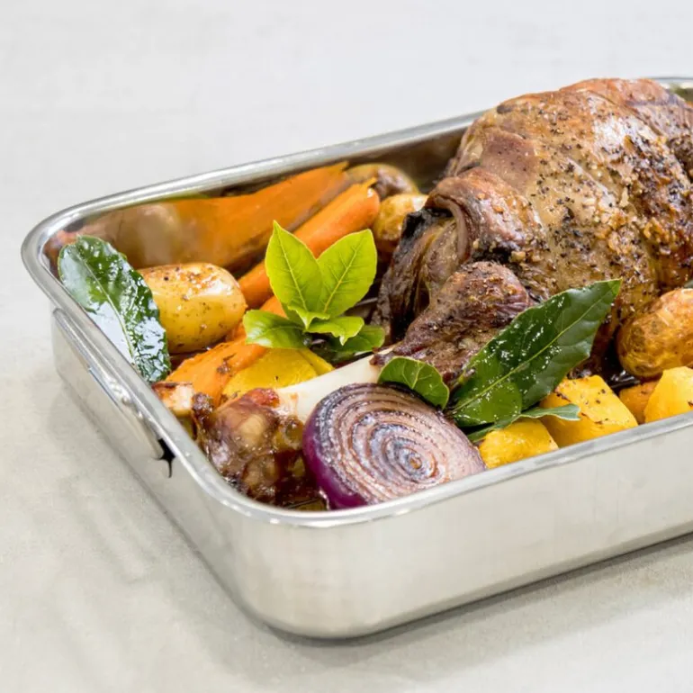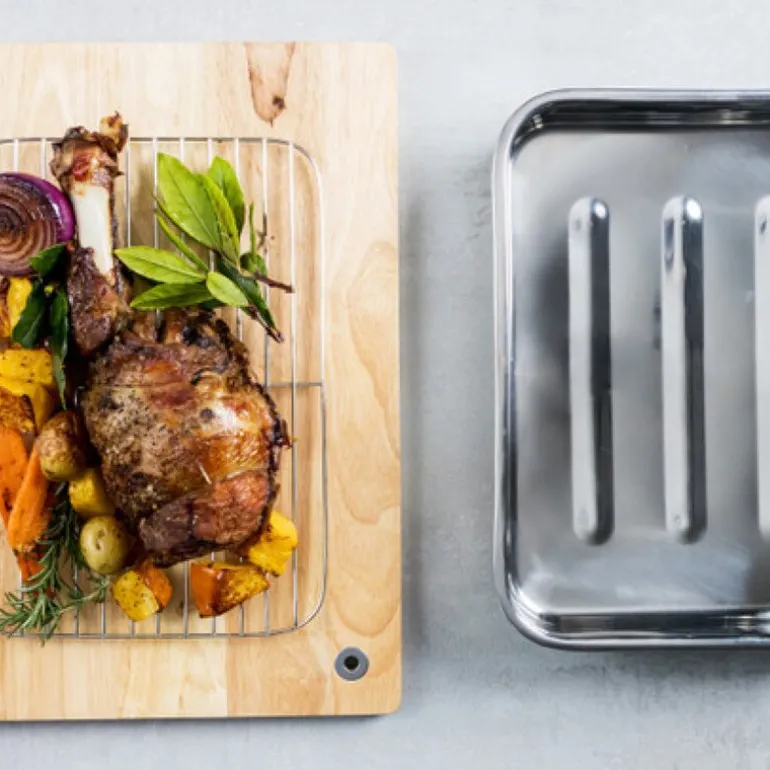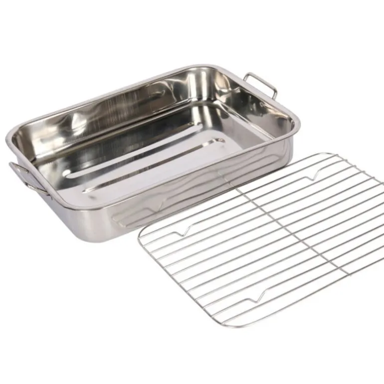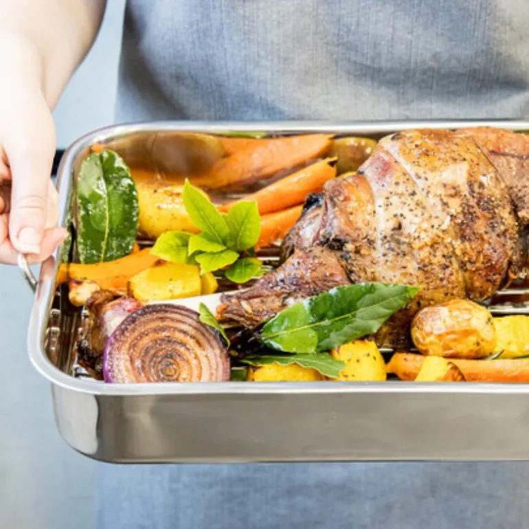 KitchenCraft Blue Card langpanne med rist (38 x 27,5 cm) i rustfritt stål er en solid og elegant panne, perfekt for å tilberede smakfulle middager for tre til fire personer. Denne mellomstore pannen er laget for å håndtere alt fra kjøtt til fjærkre på en jevn og skånsom måte, der saftene samles under kjøttet takket være den medfølgende risten. Rustfritt stål uten belegg gir høy ytelse og er ideelt for profesjonelle resultater, samtidig som det er slitesterkt og ripesikkert.