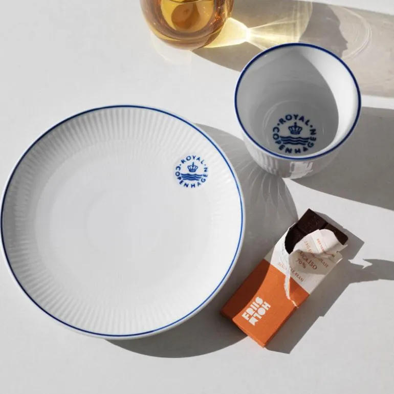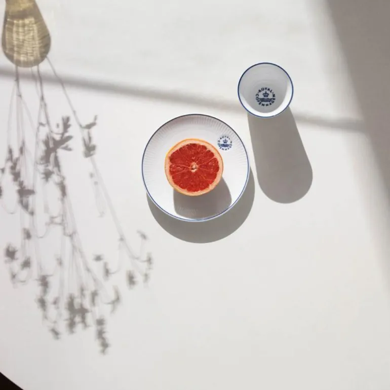 Tallerkener er basisdeler i en porselenssamling – utgangspunktet for måltider i hverdagen og festligheter i helgene. De tre tallerkenene i Blueline bærer det ikoniske Royal Copenhagen-stempelet på forsiden. Plassert nær kanten av tallerkenen, fremstår det som et vakket avbrudd fra de kjente rillene. Den karakteristiske coupe-formen skaper en bue fra kant til midten, som gir plass til å leke med anretningene og bruke hver tomme ut til den blå, håndmalte linjen. Kan vaskes i oppvaskmaskin.