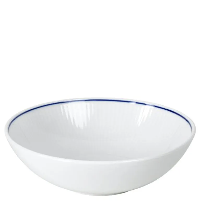 Skjønnheten til Blueline-kolleksjonen finnes i dens enkelhet: det hvite riflede porselenet omrisset med en tynn blå linje dyktig håndmalt på kanten. Denne kupéformede skålen er intet unntak. Passer til måltider til alle døgnets tider, fungerer som en skål eller en dyp tallerken.