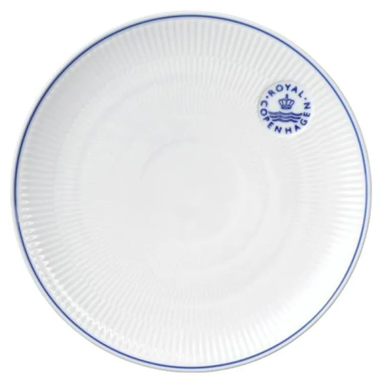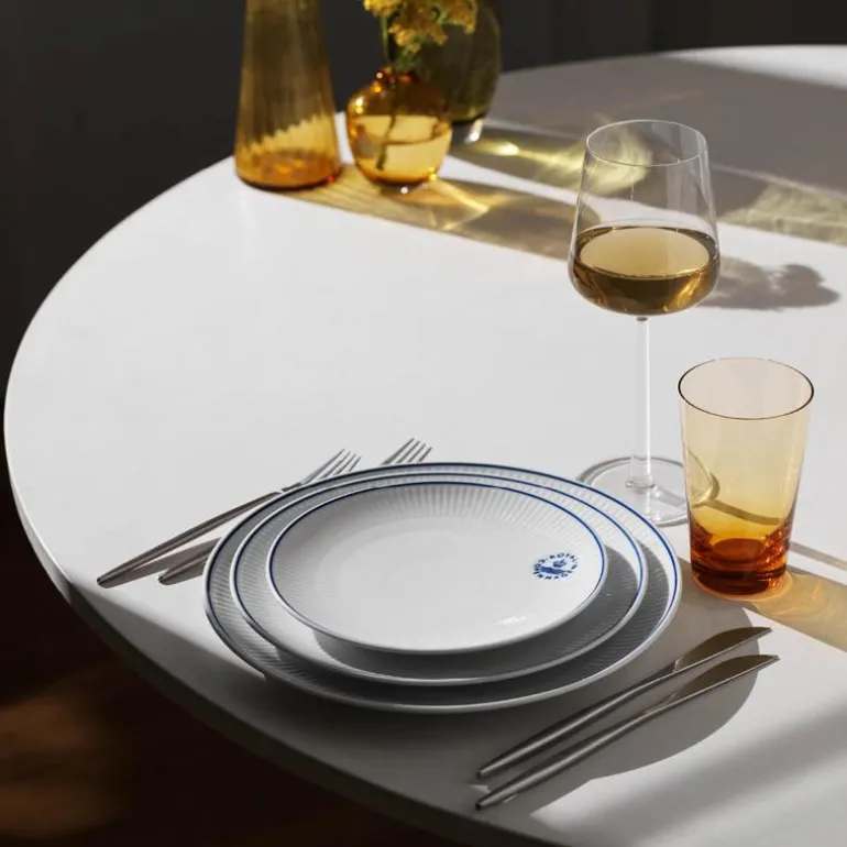 Tallerkener er basisdeler i en porselenssamling – utgangspunktet for måltider i hverdagen og festligheter i helgene. De tre tallerkenene i Blueline bærer det ikoniske Royal Copenhagen-stempelet på forsiden. Plassert nær kanten av tallerkenen, fremstår det som et vakket avbrudd fra de kjente rillene. Den karakteristiske coupe-formen skaper en bue fra kant til midten, som gir plass til å leke med anretningene og bruke hver tomme ut til den blå, håndmalte linjen. Kan vaskes i oppvaskmaskin.