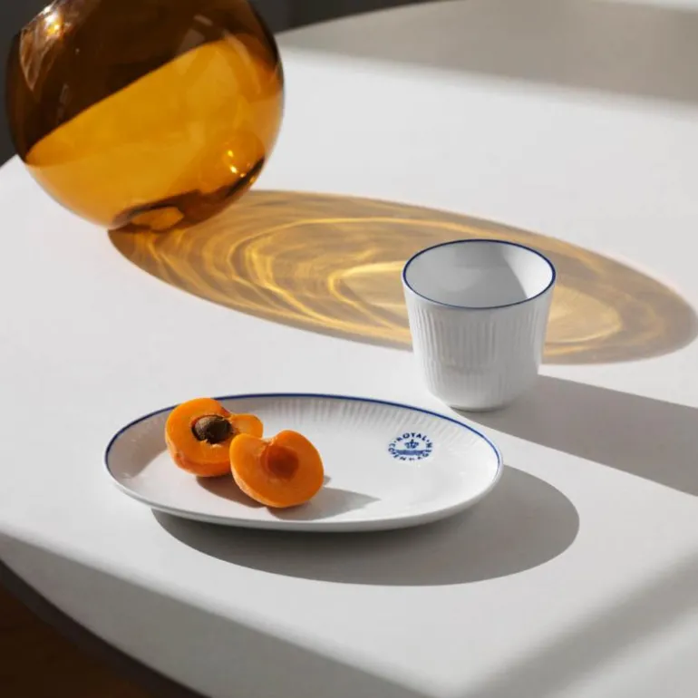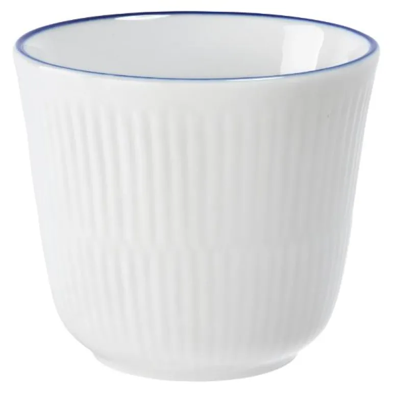 Termokruset i Blueline uttrykker funksjonell estetikk. Ingen hank, men bare rene linjer og minimalistisk skjønnhet. Som en skatt i dypet er Royal Copenhagens logo stemplet i bunnen av kruset – bare synlig ovenfra, bare synlig ved siste slurk. Fra siden er de hvite rillene og den blå linjen malt med imponerende presisjon langs kanten av kruset. Helt enkelt, helt unikt. Kan vaskes i oppvaskmaskin.