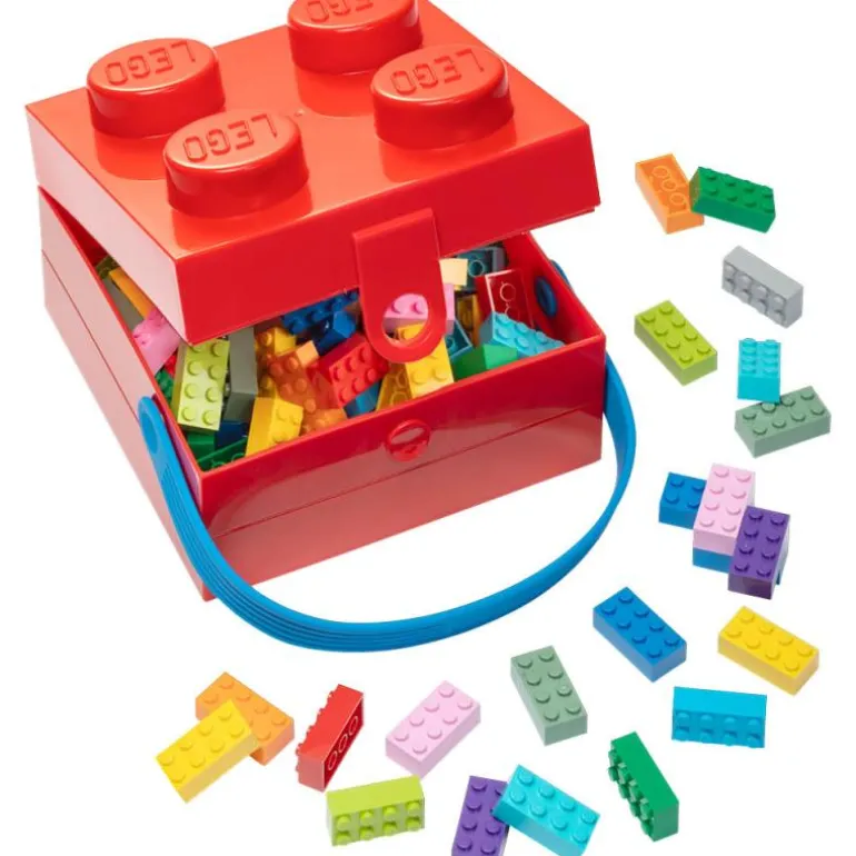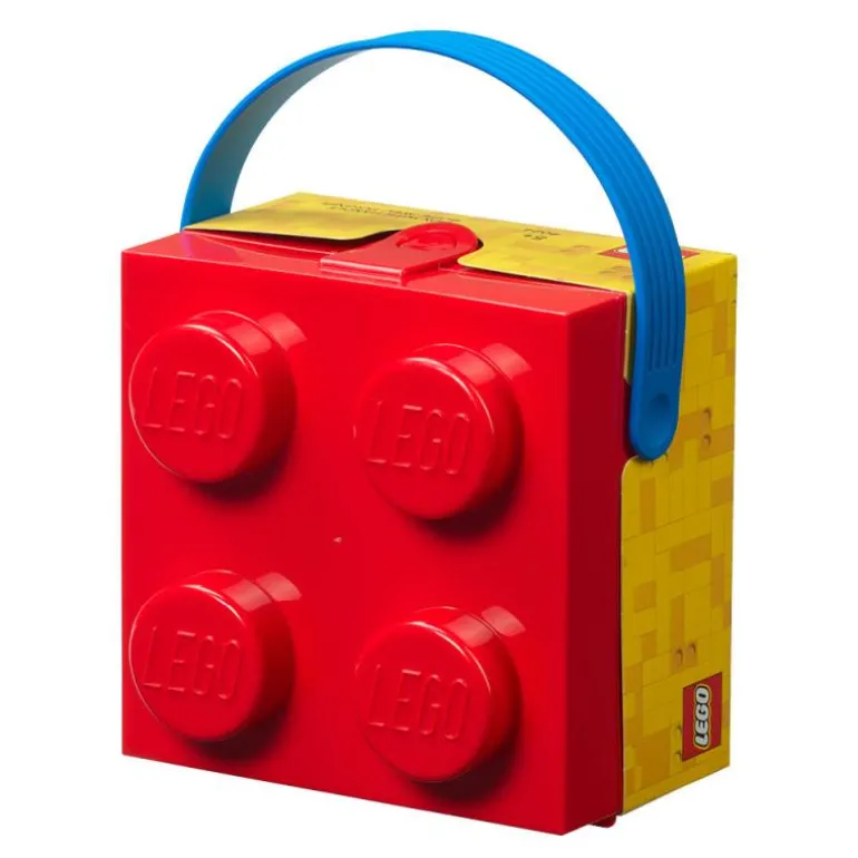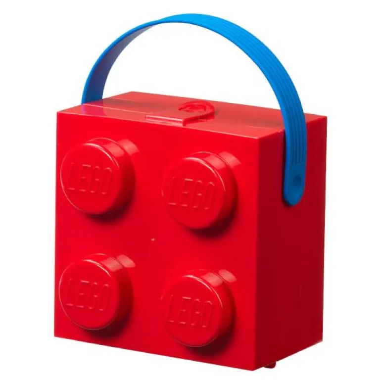Rød legoboks med blått håndtak, fra LEGO®. Den firkantede boksen i det klassiske LEGO klossedesignet har et mykt silikonhåndtak for enkel transport. Den kan brukes som matboks, oppbevaringsboks eller bæreveske. Lokket på boksen kan enkelt åpnes og låses med den lille klipsen, og det er festet til bunnen. Dette gjør den egnet selv for små LEGO fans som ønsker å ta med seg LEGO eventyret på piknik, på skolen eller hvor som helst de går.