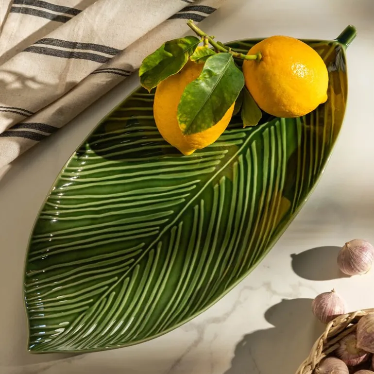 Serveringsfatet Stiernholm Botanica har en form som ligner et blad, med en langstrakt oval form og en lett buet kant. Retten er laget av steintøy og er perfekt for servering av alt fra forretter til desserter. Den kan også brukes som pynt på bordet. Stiernholm – vakker hverdag, stilfull fest.
