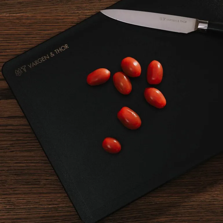 Det er solid og stabilt med seks gummiføtter som hindrer glidning under bruk. Den svarte overflaten gir et nøytralt og moderne uttrykk som passer inn i ulike kjøkkenmiljøer. Det tåler oppvaskmaskin, noe som forenkler rengjøringen i en travel hverdag. Når skjærebrettet er utslitt, kan det resirkuleres.