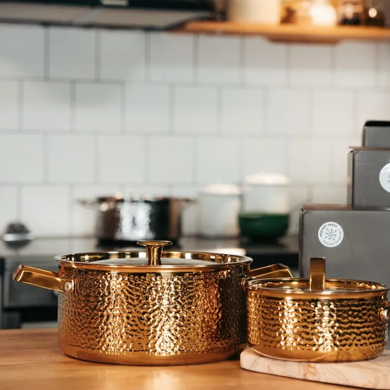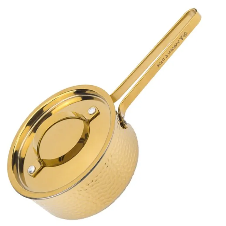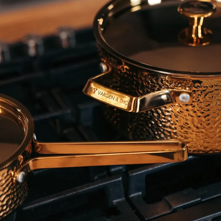 Kasserollen har et unikt hamret ytre i rent stål, kombinert med en kjerne av aluminium for optimal varmefordeling. Dette gir jevn oppvarming og sikrer enestående matlaging. Den er en del av BRASSA-serien fra Vargen & Thor og passer perfekt sammen med andre modeller som Model Lb og MEYA.