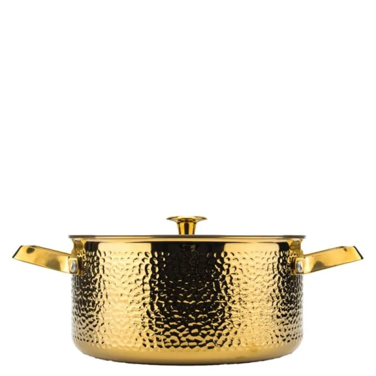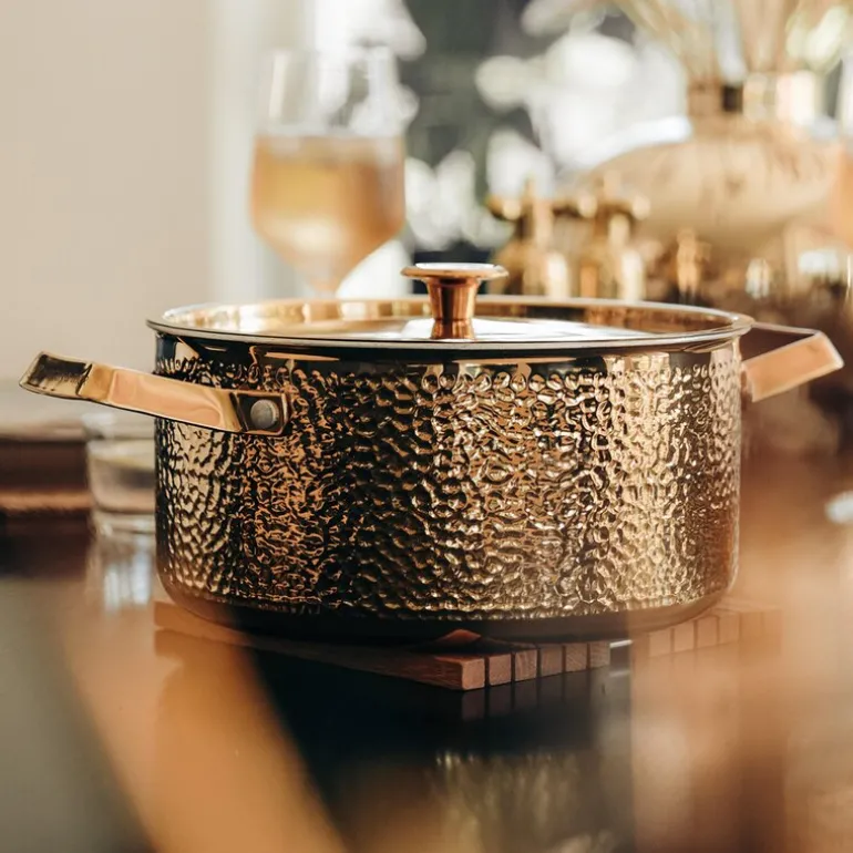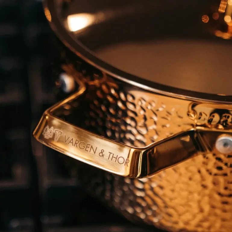 Brassa Meya gryte fra Vargen & Thor er en elegant 4-liters gryte i messing, designet for å kombinere estetikk med høy ytelse. Denne gryten har en vakker hamret overflate som gir et luksuriøst preg til kjøkkenet, mens innsiden er laget av rustfritt, børstet stål uten belegg, noe som gir både holdbarhet og enkel rengjøring.