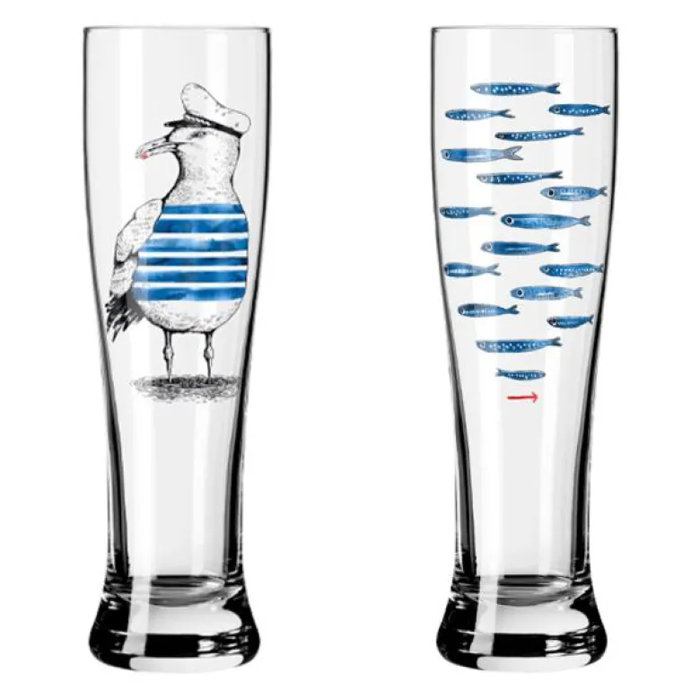 Sett med to ølglass, design nummer 13 & 14, i serien Brauchzeit fra Ritzenhoff. Alle Brauchzeit glass er produsert i Marsberg, Tyskland, og er dekorert med motiv inspirert av sjøen. Ølglassene kommer i en fin gaveeske.