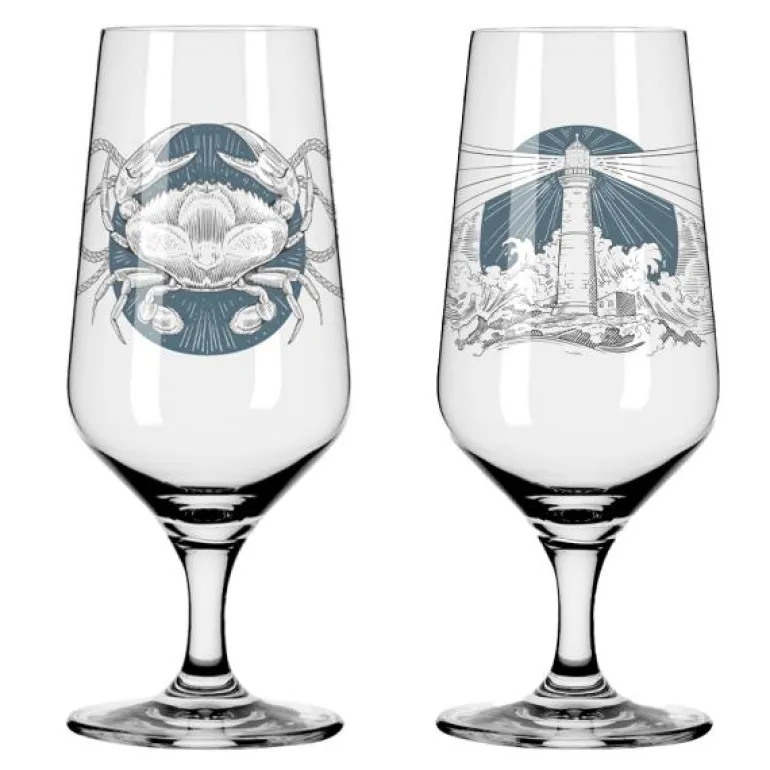 Sett med to ølglass, Pils design nummer 7 & 8, i serien Brauchzeit fra Ritzenhoff. Alle Brauchzeit glass er produsert i Marsberg, Tyskland, og er dekorert med motiv inspirert av sjøen. Ølglassene kommer i en fin gaveeske.