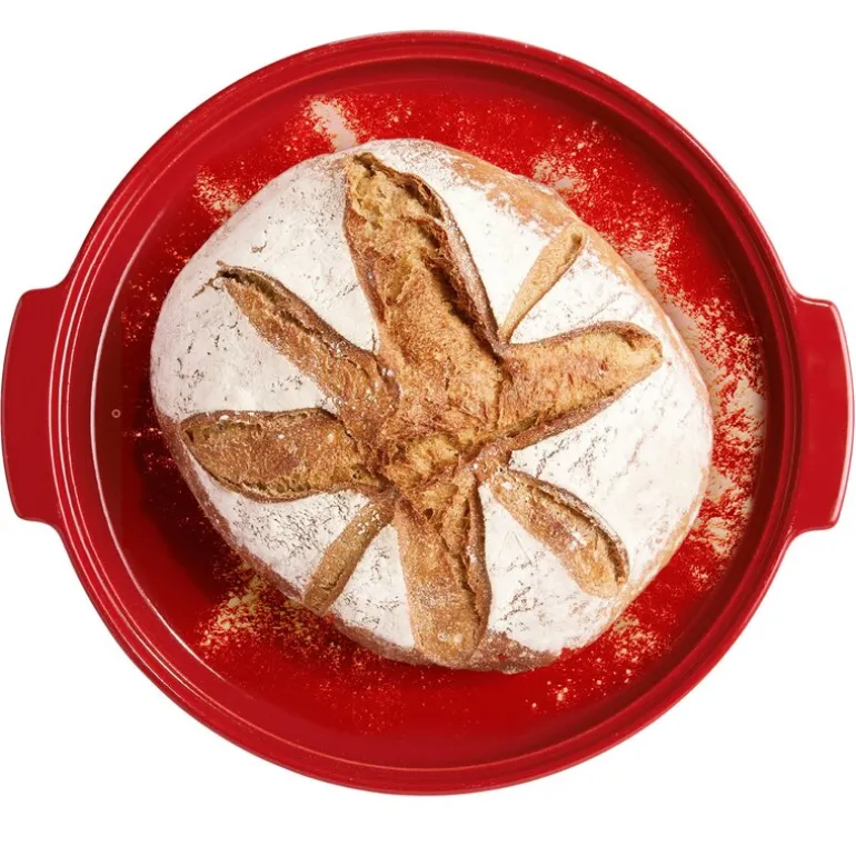 Med Emile Henrys runde brødform i rødt på 32,5 x 29,5 cm og 5,2L kan du bake brød med en profesjonell sprø skorpe og luftig innside. Den ildfaste keramikken skaper den rette fuktigheten, og gjør bakingen like effektiv som i en tradisjonell bakerovn. Formen kan også brukes opp ned, hvor lokket fungerer som en praktisk miksebolle til forberedelse og heving. Glasuren og kryssmønsteret på innsiden hindrer at deigen fester seg, samtidig som rengjøringen går som en lek. Et kvalitetsprodukt fra Frankrike med 10-års garanti – perfekt for ekte bakeglede hjemme.