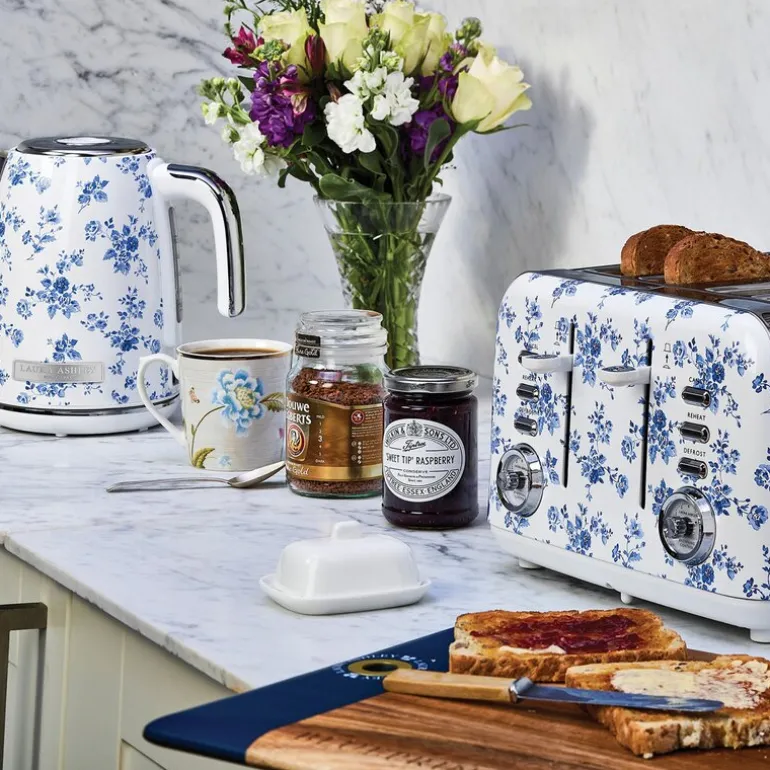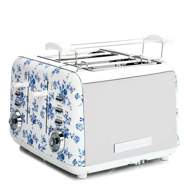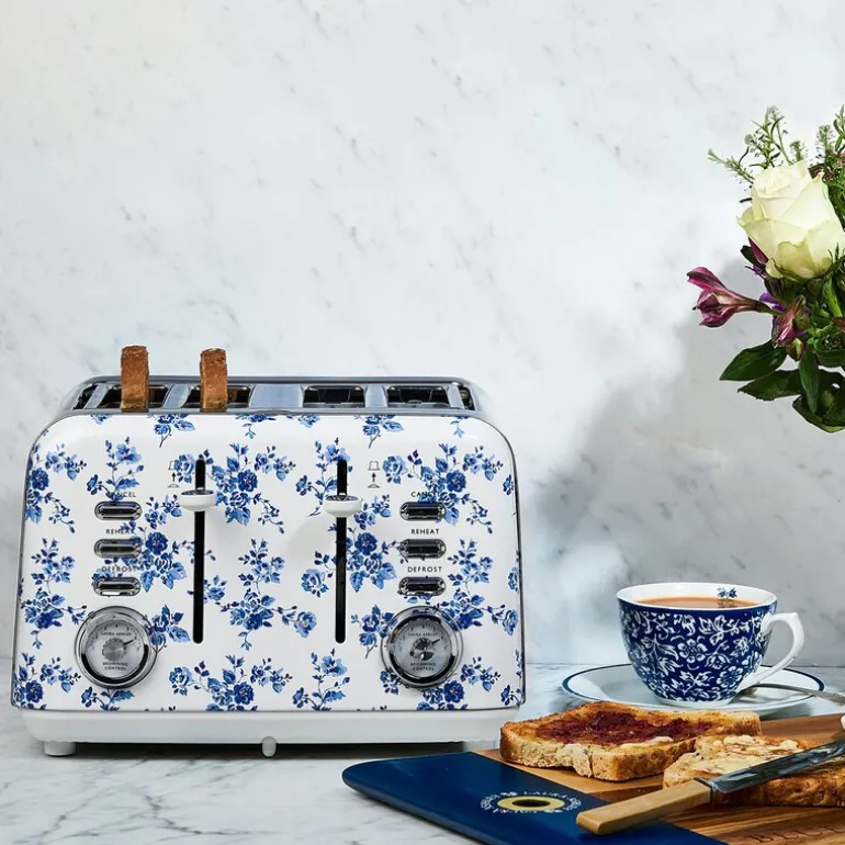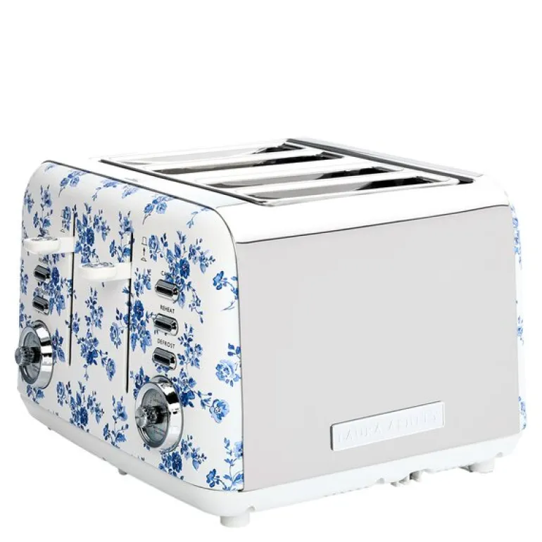 Brødrister med fire spor fra Laura Ashley i China Rose blå/hvit er laget for deg som ønsker både kapasitet og stil. Den har plass til fire skiver og er utstyrt med syv varmeinnstillinger, slik at du kan tilpasse bruningen nøyaktig etter behov. De brede sporene gir plass til ulike typer bakverk, og auto-sentreringen sørger for jevn varmefordeling.