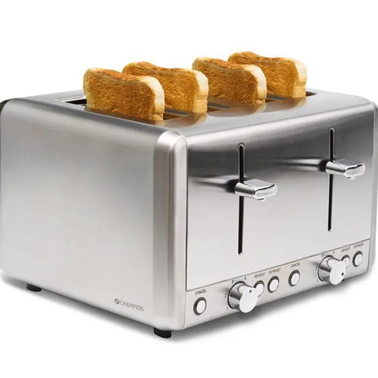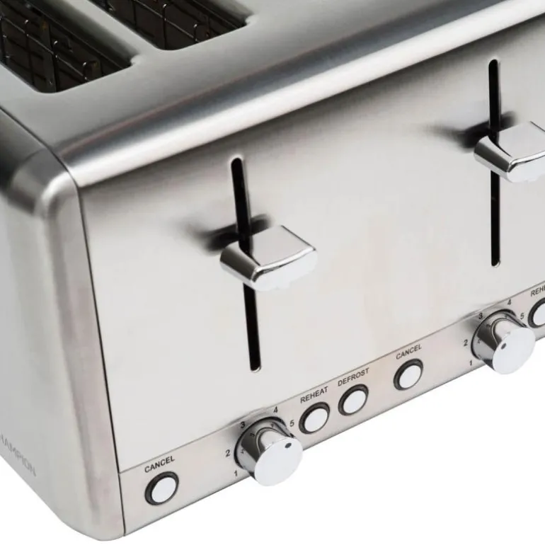 Champions brødrister gir gylne, ristede brødskiver til rolige morgenstunder med familien. 6 innstillbare varmenivåer gjør at du enkelt kan velge det nivået du ønsker på ristingen. Med et stilrent design i rustfritt stål blir brødristeren i tillegg en pen detalj på kjøkkenbenken. Brødristeren rommer 4 brødskiver per omgang, og har også funksjoner som opptining og oppvarming. – 4 skiver- Rustfritt stål- Innstillinger: 6 nivåer- Automatisk sentrering av brødskivene- Effekt: 850–1000 W- Funksjoner: stopp, oppvarming, opptining og risting- Smulebrett – Varmebestandig plast- Gummiføtter- Ledningsoppbevaring- Automatisk avstenging- Ledningslengde: 0,75 m- Størrelse (L x H x B): 26,1 x 18,8 x 30,5 cm- Vekt: 2,4 kg