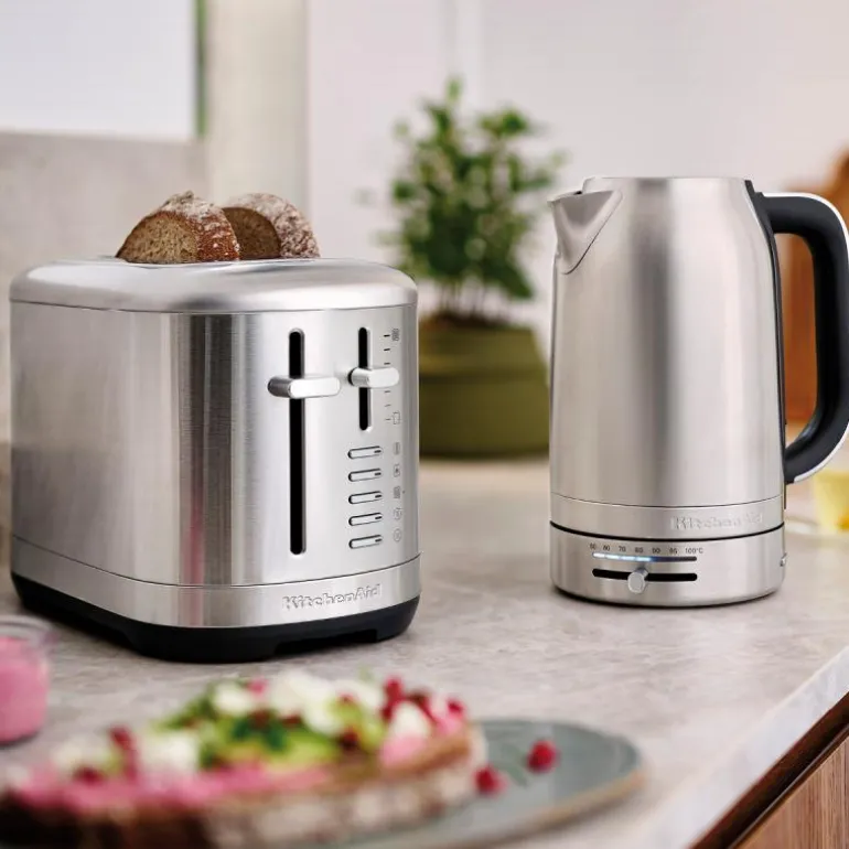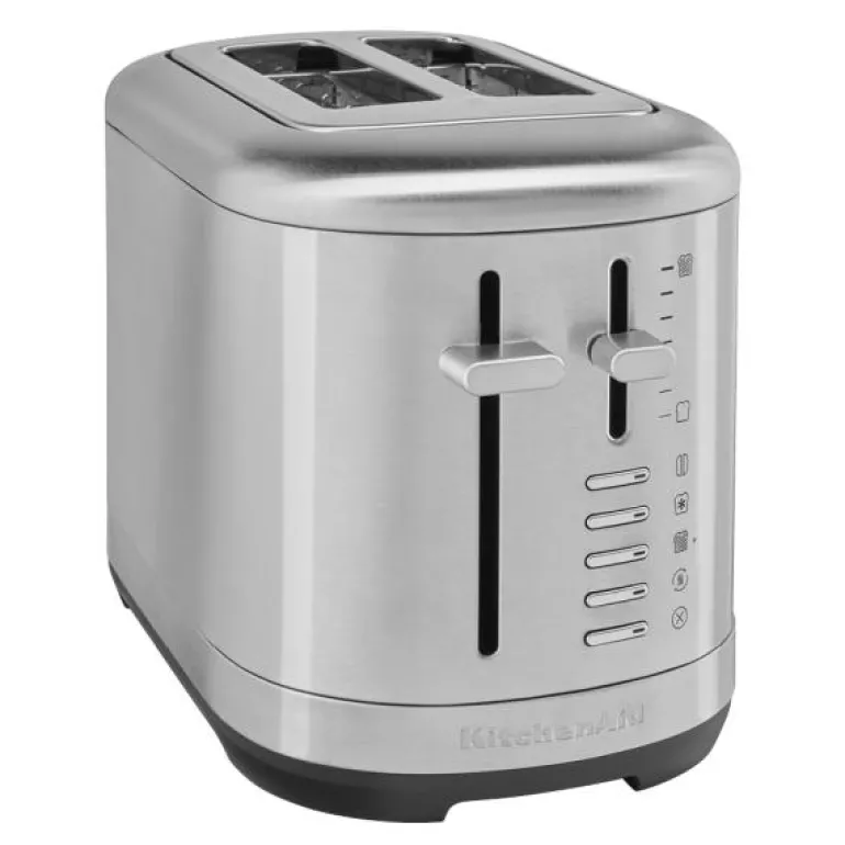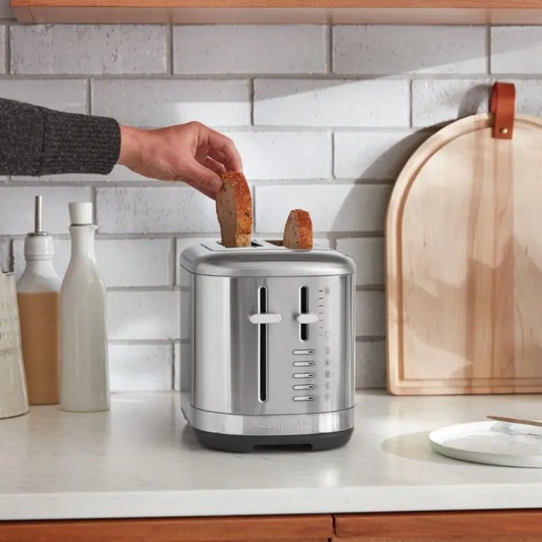 Brødrister med ekstra brede spor 5KMT2109ESX 2 skiver i rustfritt stål, fra KitchenAid. Med ekstra brede spor på 3,2 cm, kan brødristeren riste en rekke former og størrelser av brød, inkludert hjemmelaget brød, eller håndverksbrød. Den har manuell kontroll, og konstruksjon i helmetall, som gjør den slitesterk og bygget or daglig bruk.