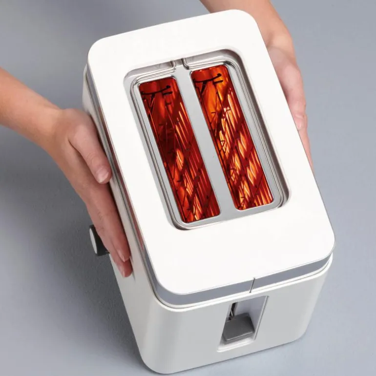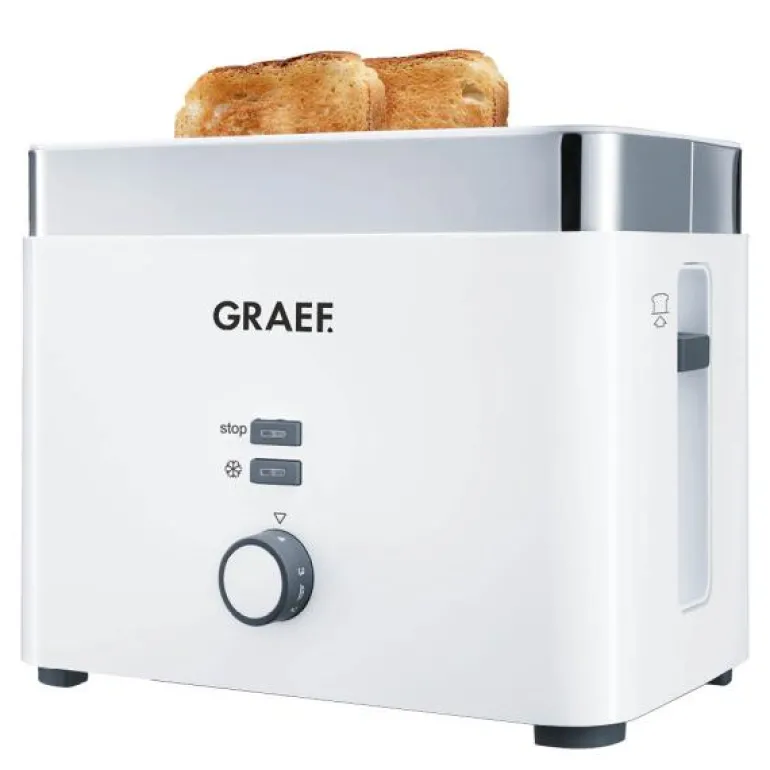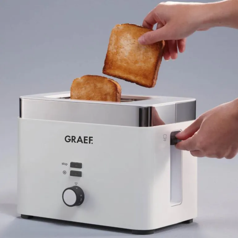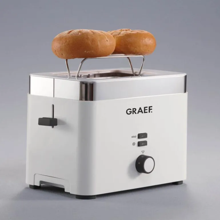 Den hvite brødristeren (TO61) fra Graef kombinerer retrodesign med et moderne og elegante utseende med en fin sølvkant. Brødristeren er utstyrt med fine detaljer som rød, opplyst stoppknapp, grønn opplyst knapp for opptining, roterende innstillning av bruningsgrad, integrert nedsenkningsknapp og en risterfunksjon på 2 stålvaiere, som enkelt kan heves og senkes via knapp på siden for bl. a franskbrød eller baguetter. Med sitt elegante utseende passer brødristeren inn i den nordiske, rene stilen og er en god hjelper i alle kjøkken. Det avtakbare smulebrettet gjør det enkelt å rengjøre eventuelle rester, og den kveilede kabelen gjør det enkelt å oppbevare brødristeren. Den integrerte auto OFF funksjonen slår seg av hvis brødet sitter fast.