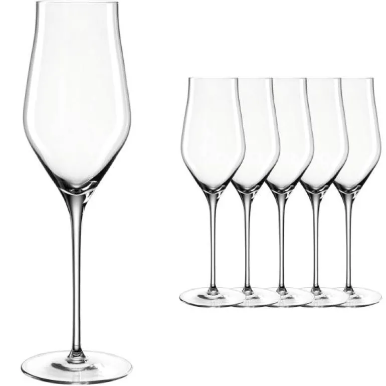 Champagneglass fra Leonardos glasskolleksjon Brunelli. Brunelli-glassserien utmerker seg ved sitt funksjonelle design. Det er en elegant og sofistikert glasserie som passer til en moderne livsstil og kan brukes hver dag. Glassene er laget av Teqton-glass som er støtbestandig og beholder glansen selv om du vasker glassene i oppvaskmaskinen. Glassene er behagelige å holde og deres form gir en optimal utvikling av drinkens aroma. Brunelli glass passer både i hjemmet så vel som i restaurant- og barmiljøer. Volum: 340 ml Mål: Ø 5 cm