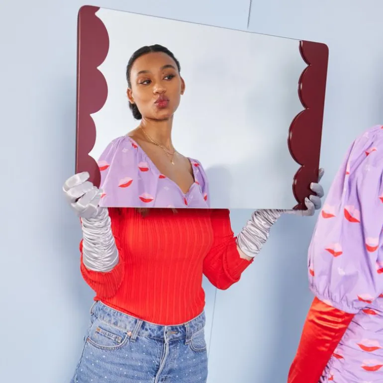De myke avrundede formene er tegnet for hånd og skaper lekne halvsirkler som får oss til å tenke på luftige skyer. Rammen har et annet design hvor den ikke sitter på klassisk vis med fire sider, men kun på to av sidene. Dette gjør den lettere og muliggjør en jevnere kombinasjon med flere objekter. Rammen er spraylakkert mdf og har to forskjellige oppheng (horisontalt og vertikalt) for å kunne variere måten den bæres på. Et speil vi absolutt ønsker å se i mange hjem for å lyse opp et rom. Tilgjengelig i beige og burgunder. Størrelse 40×70 cm. Design Byon Studio.