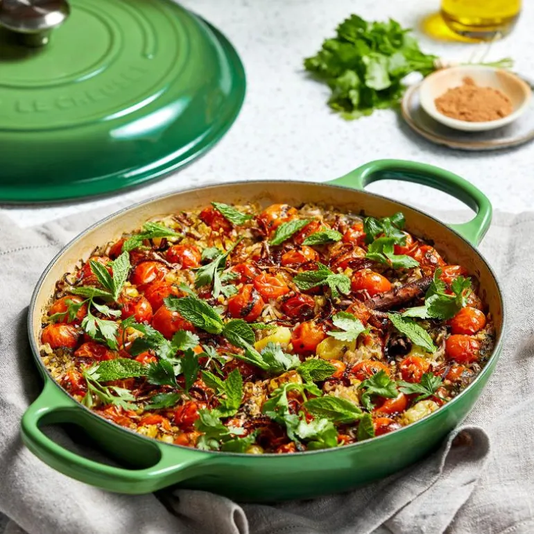 Le Creusets buffetgryte i støpejern har ideell form og størrelse for klassiske risretter som paella, risotto og couscous. Den brede og flate buffetgryten sikrer maksimal kontakt med varmekilden, og det er rikelig med plass til at ris og couscous kan utvide seg.