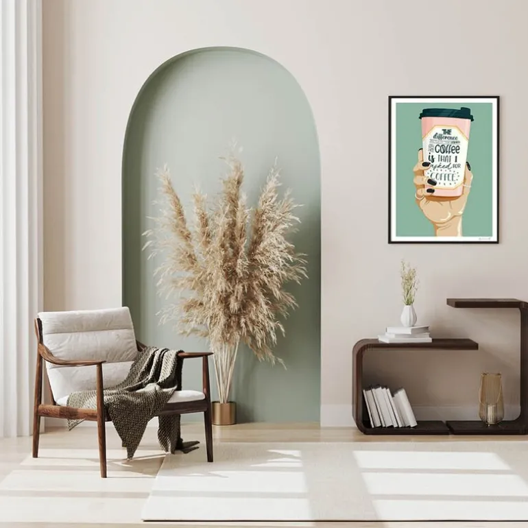 ByKammille poster 50×70 cm i asked for coffee fra Poster & Frame. Humoristisk illustrasjon av kaffe i hånden til en kvinne som vet hvem hun er.