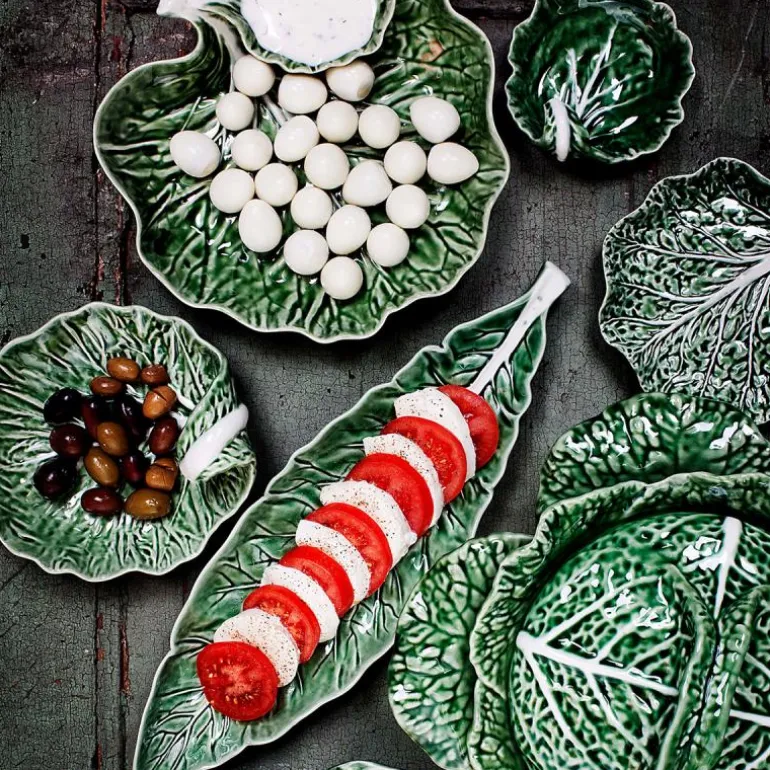 Cabbage Fat dypt 28 cm fra Bordallo Pinheiro. Kjøkkenserien Cabbage er en serie med svært detaljerte og realistisk gjengitte skåler og fat som forestiller kålblader, designet av keramikeren Bordallo Pinheiro. Fatene og skålene blir et vakkert innslag til borddekkingen og det større fatet passer perfekt til ost, brød eller frukt.