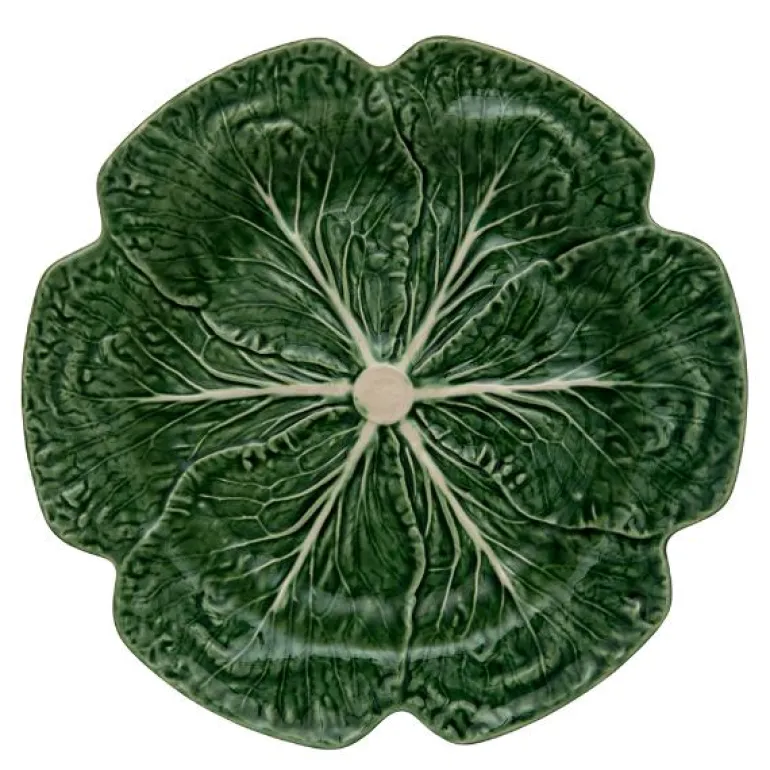 Cabbage Fat 30,5 cm fra Bordallo Pinheiro. Kjøkkenserien Cabbage er en serie med svært detaljerte og realistisk gjengitte skåler og fat som forestiller kålblader, designet av keramikeren Bordallo Pinheiro. Fatene og skålene blir et vakkert innslag til borddekkingen og det større fatet passer perfekt til ost, brød eller frukt.