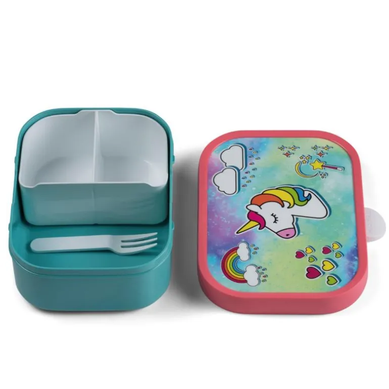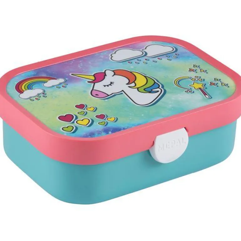 Robust og dekorativ matboks, Campus fra Mepal, med eventyrlig enhjørningmotiv. Den har en ny og forbedret lukkemekanisme som er enda enklere for barn å åpne/lukke. Matboksen måler 17,5 x 13 x 6 cm og inneholder en liten gaffel og et avtagbart innlegg med to små rom. Gjennom generasjoner har barn benyttet Mepals Campus skoleprodukter til matpakken og drikkevarer. Matboksen har tettsluttende lokk som klikkes fast og løsnes ved å trykke på knappen i front, så det er ingen risiko for at matboksen åpner seg i sekken. Matboksen fås i mange flotte, klare farger og med mange forskjellige tøffe og søte motiv. ABS er et robust og støtsikkert materiale, som har en blank og dekorativ overflate. Produktet er egnet for oppvaskmaskin, men ikke til mikroovn og fryser. Gjennom generasjoner har barn benyttet Mepals Campus skoleprodukter til matpakken og drikkevarer. Matboksen har tettsluttende lokk som klikkes fast og løsnes ved å trykke på knappen i front, så det er ingen risiko for at matboksen åpner seg i sekken. Matboksen fås i mange flotte, klare farger og med mange forskjellige tøffe og søte motiv. ABS er et robust og støtsikkert materiale, som har en blank og dekorativ overflate. Produktet er egnet for oppvaskmaskin, men ikke til mikroovn og fryser.
