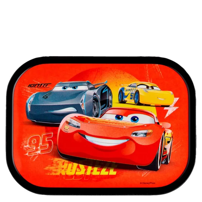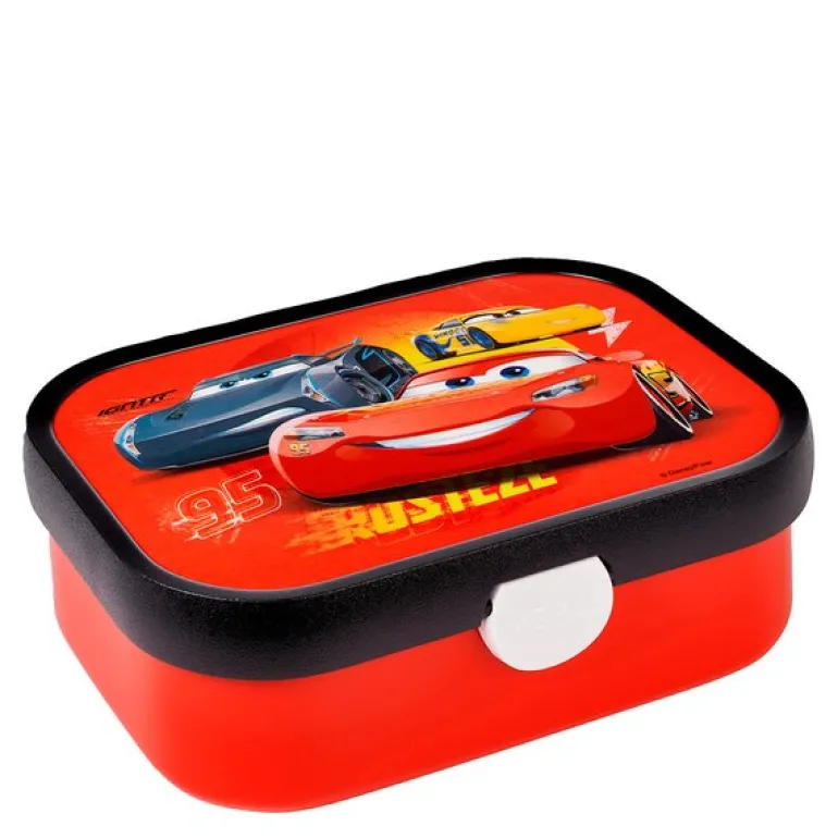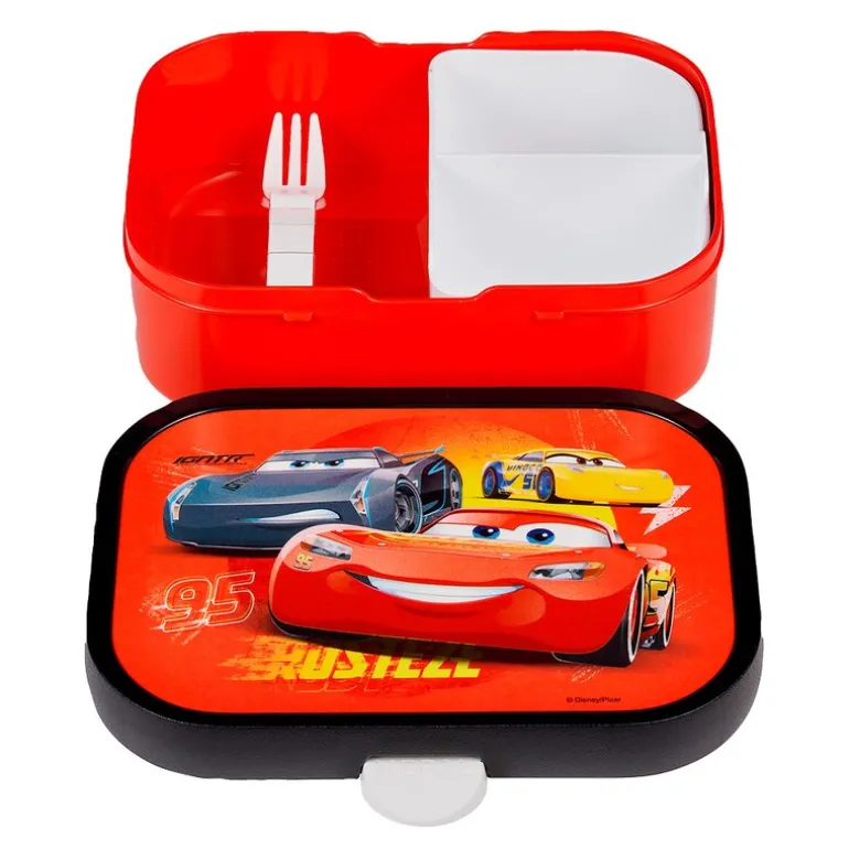 Mepal Campus matboks med Cars motiv er en robust og romslig løsning for barnas matpakker. Med målene 17,5 x 13 x 6 cm har boksen god plass til både brødskiver, frukt og snacks. Den leveres med en praktisk liten gaffel og en løs innsats med to små rom, som gjør det enkelt å organisere maten.