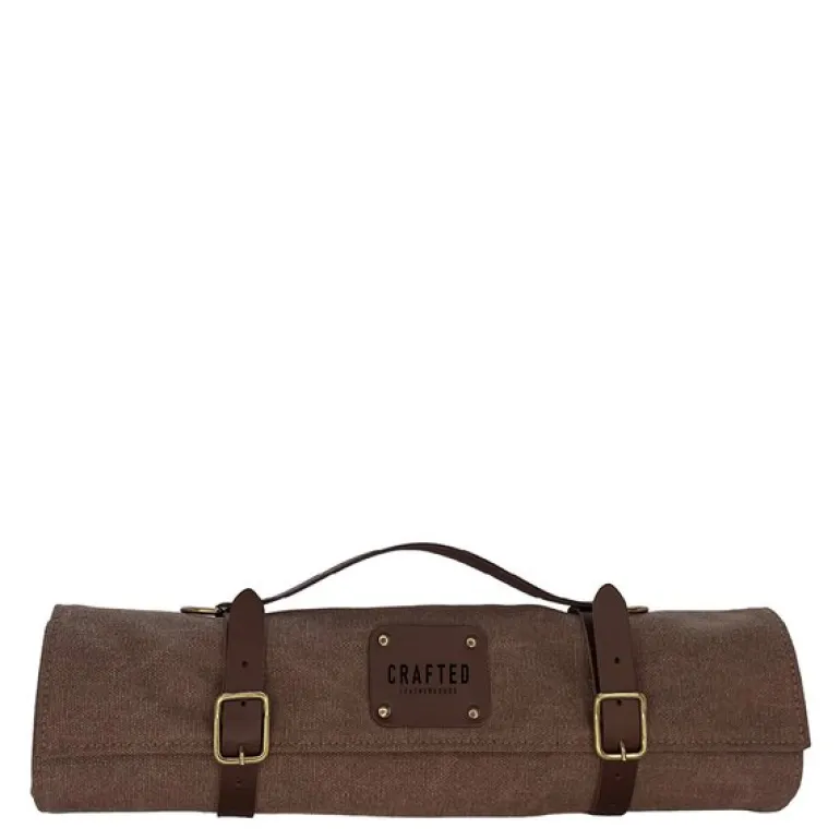 Den håndlagde knivmappen i brun skinn fra Crafted, måler 41 cm og er laget for oppbevaring av syv kniver i forskjellige størrelser, med innvendige lommer tilpasset variasjon i bladlengde. Denne knivmappen er perfekt for både profesjonelle kokker og entusiastiske hobbykokker som ønsker en solid og stilren løsning for knivoppbevaring.