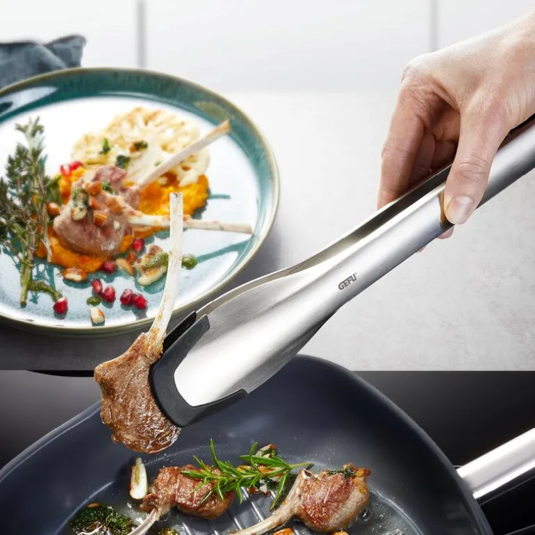 Capto kjøkkentang fra Gefu kombinerer brukervennlighet med slitesterke materialer for en trygg og komfortabel matlaging. De varmebestandige silikonspissene beskytter stekepanner og gryter med belegg mot riper, samtidig som de gir et sikkert grep på maten. Tangen tåler temperaturer opptil 250 °C og har en smart lukkemekanisme som gjør den enkel å oppbevare. Opphengssløyfen gir mulighet for praktisk oppheng på en kjøkkenstang, slik at du alltid har den for hånden. Den er laget av høykvalitets rustfritt stål og silikon, og kan rengjøres i oppvaskmaskin. Med en lengde på 33 cm er den allsidig og egner seg godt til både matlaging og servering.