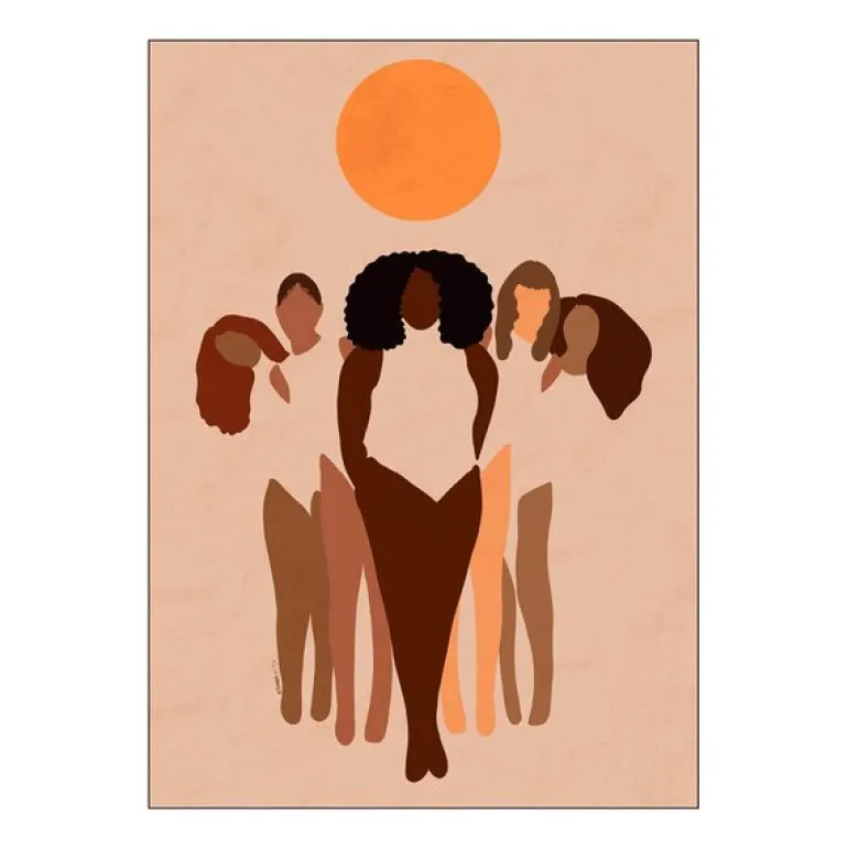 «W.O.M.E.N»-plakaten av Carelle N’guessan er et kraftig feministisk portrett. Den har en ansiktsløs kvinne i sentrum, omgitt av fire kvinner. Over dem lyser en solnedgangsfarget sol opp scenen. Fargepaletten inkluderer brune, svarte, gule og nøytrale toner, og skaper en fengslende collage av kvinnekroppen og styrker mennesker.