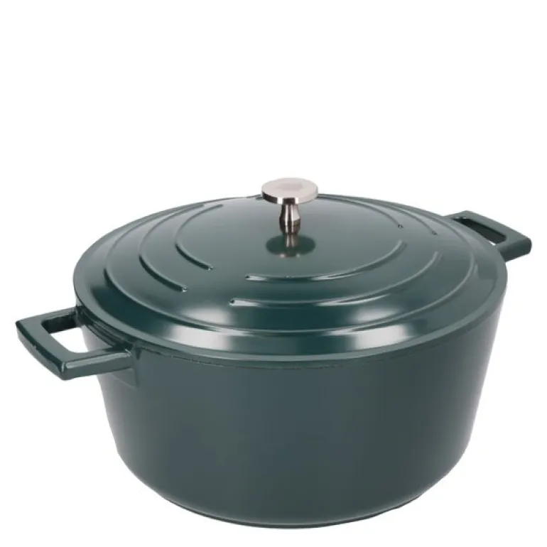 MasterClass 5-liters gryte fra Cast Aluminium-serien i hunter green, kombinerer funksjonalitet og stil. Med en kapasitet på 5 liter og en diameter på 29 cm, er denne gryten godt egnet for tilberedning av store måltider, enten til familien eller ved servering av gjester. Den lette støpte aluminiumen gir effektiv varmefordeling for rask og jevn tilberedning, mens det ripebestandige dobbeltlags non-stick-belegget sikrer enkel matfrigjøring og redusert behov for olje, noe som gjør den ideell for sunnere matlaging.