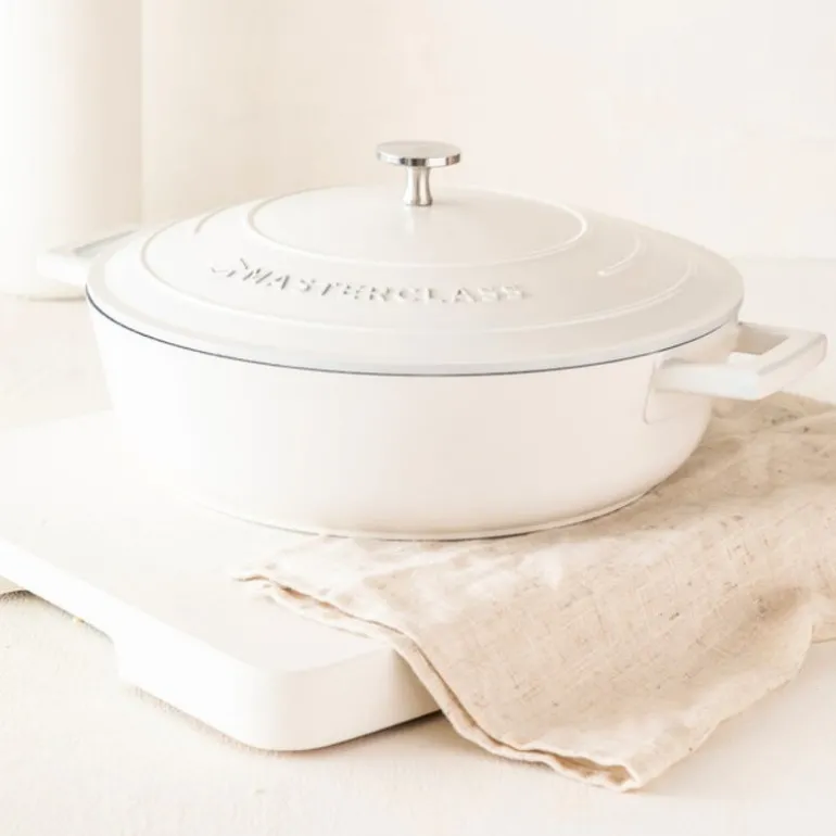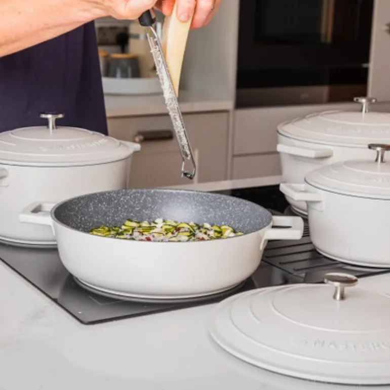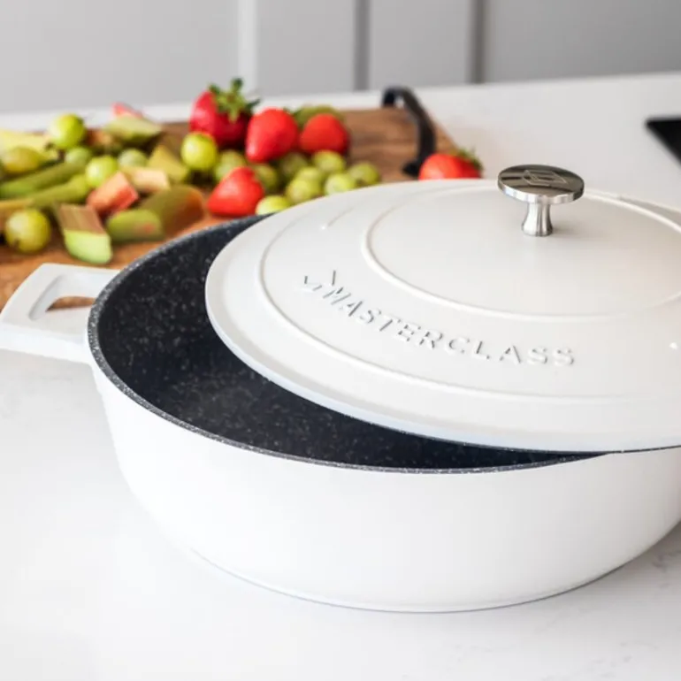 MasterClass lav kremfarget gryte i støpt aluminium på 4 liter kombinerer lett håndtering med solid funksjonalitet, ideell for daglig bruk på kjøkkenet. Med samme varmefordeling som støpejern, men mye lettere, sørger denne gryten for jevn tilberedning og rask smakutvikling i alle typer retter. Det slitesterke dobbeltlags non-stick-belegget gir høy motstandskraft og krever mindre olje, perfekt for sunnere matlaging.