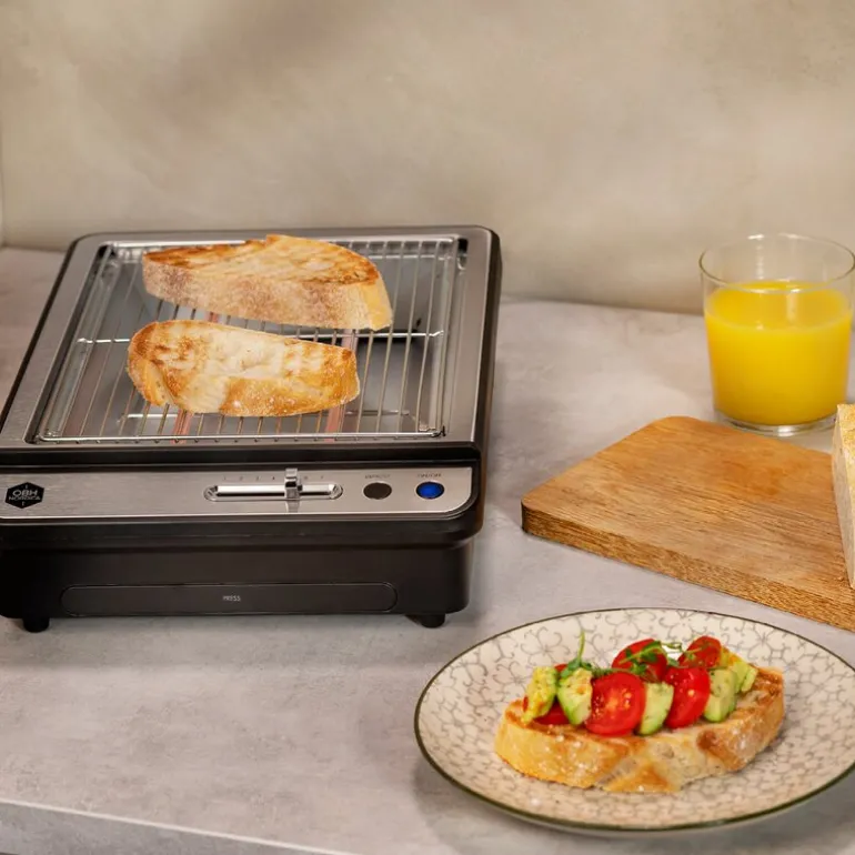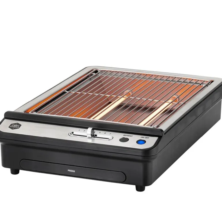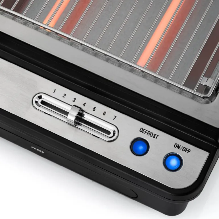 Horisontal brødrister som gjør hverdagen enklere ? rist store brødskiver, bagels eller croissanter som ikke får plass i en vanlig brødrister. Denne horisontale brødristeren med stor stekeflate på 20×25 cm er fleksibel, og du kan riste og varme flere boller, brødskiver eller croissanter samtidig. Denne er veldig praktisk hvis du har bakverk fra gårsdagen som du vil varme opp igjen. Legg dem ganske enkelt på risten, og på få minutter føles de ferske igjen. To varmeelementer sikrer at alt blir jevnt ristet. Du kan enkelt velge mellom risting eller oppvarming ved å justere ristenivået med timeren. Det gjør at brødristeren også er veldig praktisk når du skal tine fryst bakverk. Med avtagbart smulebrett er den enkel å rengjøre. Alle smuler faller gjennom risten og samles på brettet, som enkelt kan tømmes. Den er praktisk å oppbevare og tar ikke mye plass. Brødristeren har panel i rustfritt stål, skrå front og et nytt utseende på knappene. Kontrollampen lyser tydelig når den er i bruk. 700 W effekt gir rask oppvarming, og dermed reduseres både steketiden og strømforbruket.