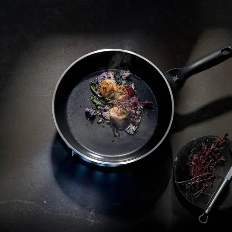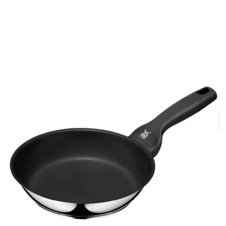 Stekepanne i stål, CeraDur Profi 20 cm fra WMF. Pannene i WMF-serien CeraDur Profi er fremstilt av førsteklasses rustfritt Cromargan® og beholder selv ved svært høye temperaturer på opptil 400 °C formen sin på komfyren. Innvendig er de kledd med den keramiske CeraDur-forseglingen. Det gjør dem ytterst antiklebende og lette å rengjøre. Gi pannen din en utfordring! Skru opp varmen, legg biffen din i midten, la den frese og syde, hold den i gang og ta tak i det ergonomisk utformede skaftet med flammebeskyttelse når du snur og sauterer biffen din. TransTherm®-universalbunnen fordeler varmen raskt og holder lenge på den. Dermed kan kjøtt eller sprø grønnsaker trekke energieffektivt på pannen og utfolde aromaene sine til fulle. Serien CeraDur Profi er egnet til alle komfyrtyper og omfatter en stekepanne med langt håndtak og en panne med to håndtak i tre størrelser. Det er 2 års garanti på CeraDur Profi-panner.