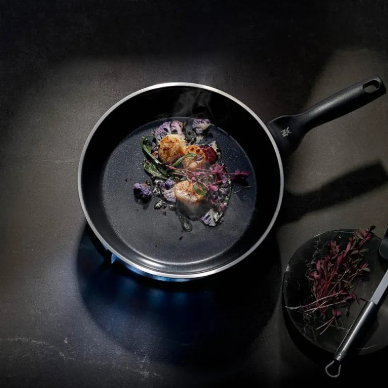 Stekepanne i stål, CeraDur Profi 24 cm fra WMF. Pannene i WMF-serien CeraDur Profi er fremstilt av førsteklasses rustfritt Cromargan® og beholder selv ved svært høye temperaturer på opptil 400 °C formen sin på komfyren. Innvendig er de kledd med den keramiske CeraDur-forseglingen. Det gjør dem ytterst antiklebende og lette å rengjøre. Gi pannen din en utfordring! Skru opp varmen, legg biffen din i midten, la den frese og syde, hold den i gang og ta tak i det ergonomisk utformede skaftet med flammebeskyttelse når du snur og sauterer biffen din. TransTherm®-universalbunnen fordeler varmen raskt og holder lenge på den. Dermed kan kjøtt eller sprø grønnsaker trekke energieffektivt på pannen og utfolde aromaene sine til fulle. Serien CeraDur Profi er egnet til alle komfyrtyper og omfatter en stekepanne med langt håndtak og en panne med to håndtak i tre størrelser. Det er 2 års garanti på CeraDur Profi-panner.