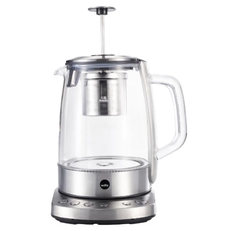 Vannkoker/tekoker som lar deg velge mellom 4 ulike temperatur til ulike tetyper, to lokk, ett til brygging og ett til servering, glass og rustfritt stål, 1,25l kapasitet, hold varm funksjon, 5 års garanti