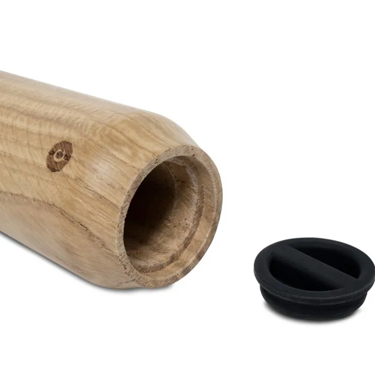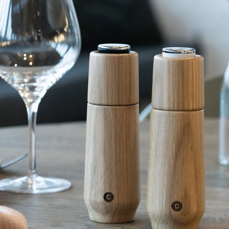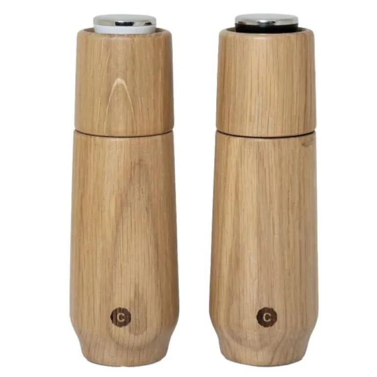Kvernene er laget av FSC®-sertifisert eik, noe som sikrer at materialet kommer fra bærekraftig forvaltede skoger. Den høypolerte settskruen gir et stilrent preg, og de diskrete hvite og svarte ringene gjør det enkelt å skille mellom salt og pepper. Takket være silikonpluggen i bunnen er det enkelt å fylle kvernene, og designet sørger for at de ikke drysser krydder på bordet.