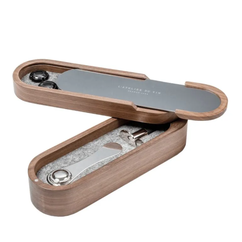 L’Atelier du Vins eksklusive champagnesett er laget for de som verdsetter både eleganse og funksjon. Innpakket i en stilig valnøttboks, inneholder settet to askebegre, samt et speil som skjuler et rom for oppbevaring av minnerike vinkorker. Med en skjult mekanisme åpnes et ekstra rom, der du finner en spesialdesignet champagnekorkåpner og en propp for å bevare boblene i åpne flasker. Perfekt for å gi bort eller unne seg selv, er dette champagnesettet det ideelle verktøyet for alle som elsker musserende vin.